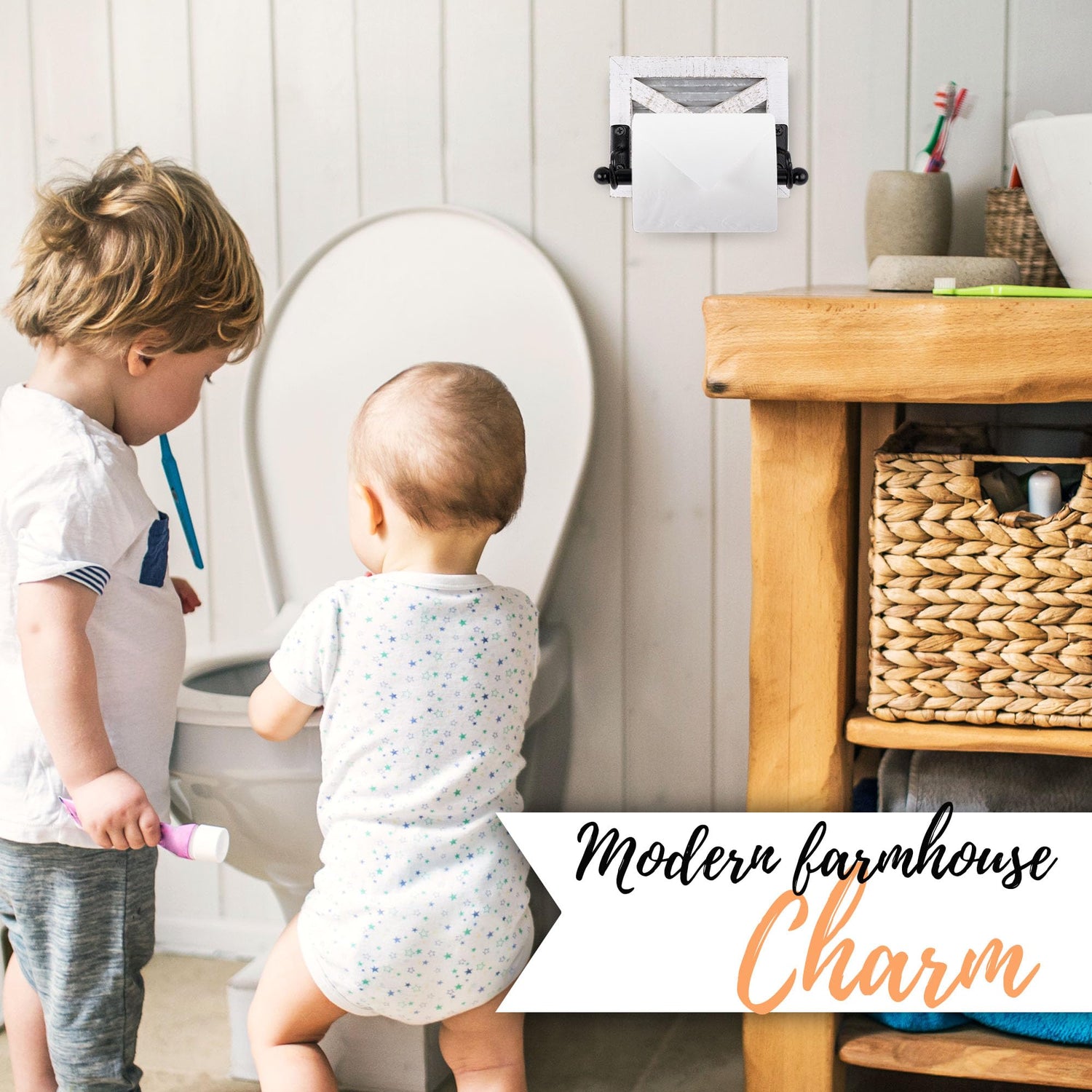 - Farmhouse Bathroom White Rustic Toilet Paper Holder - A chic industrial toilet paper holder is made from weathered solid wood and corrugated galvanized metal, adding a rustic touch to any bathroom wall and bringing life to your bathroom decor farmhouse style