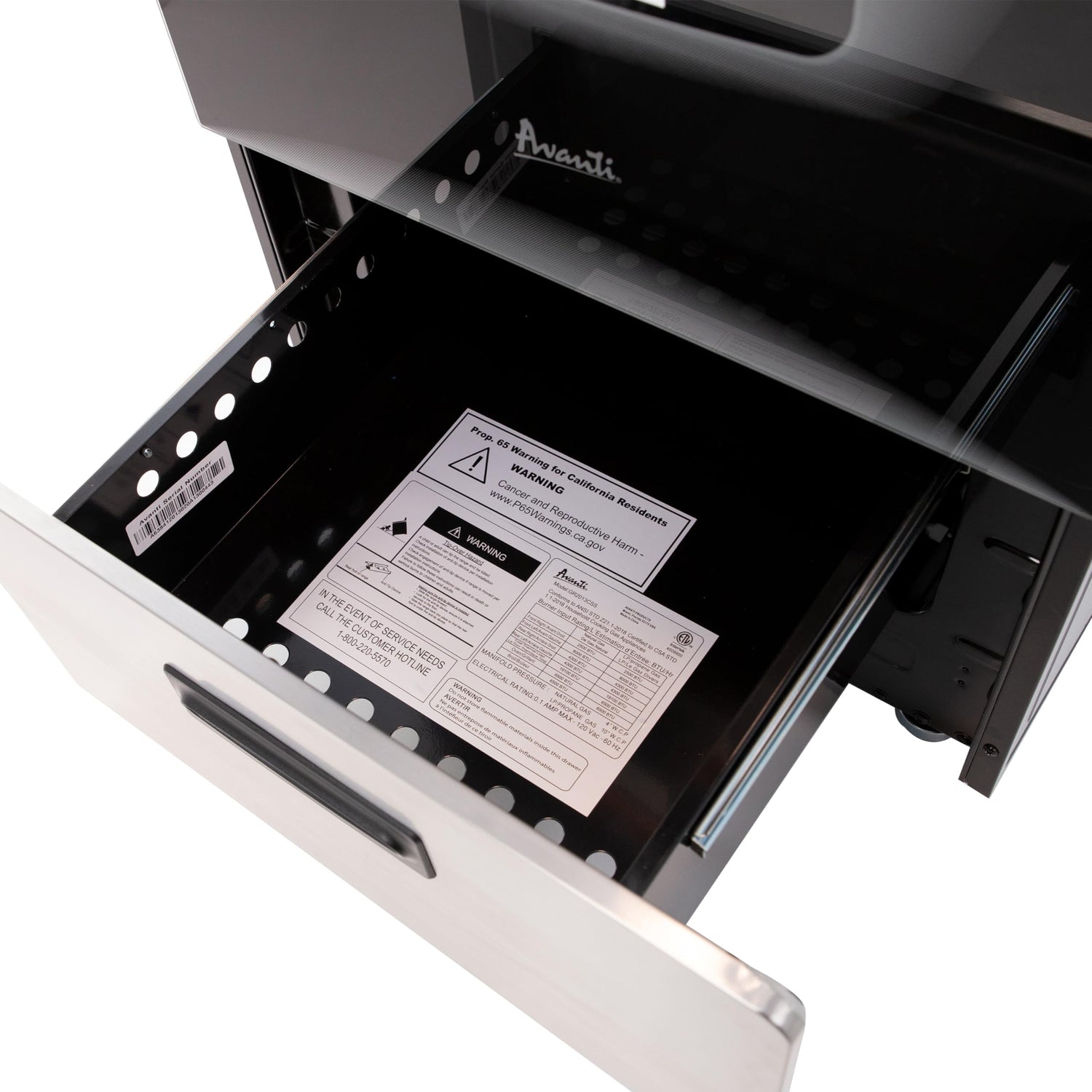 Details: Save kitchen space with this compact, white range from Avanti. The perfect compact gas range for the office, studio apartment, RV, tiny home, condo, vacation home, or anywhere you need to save space in a small kitchen. This 20-inch-wide range features 4 sealed burners (1 rapid, 2 semi-rapid, 1 simmer). The oven has a storage drawer at the bottom and a broiler that comes with a broiling pan.