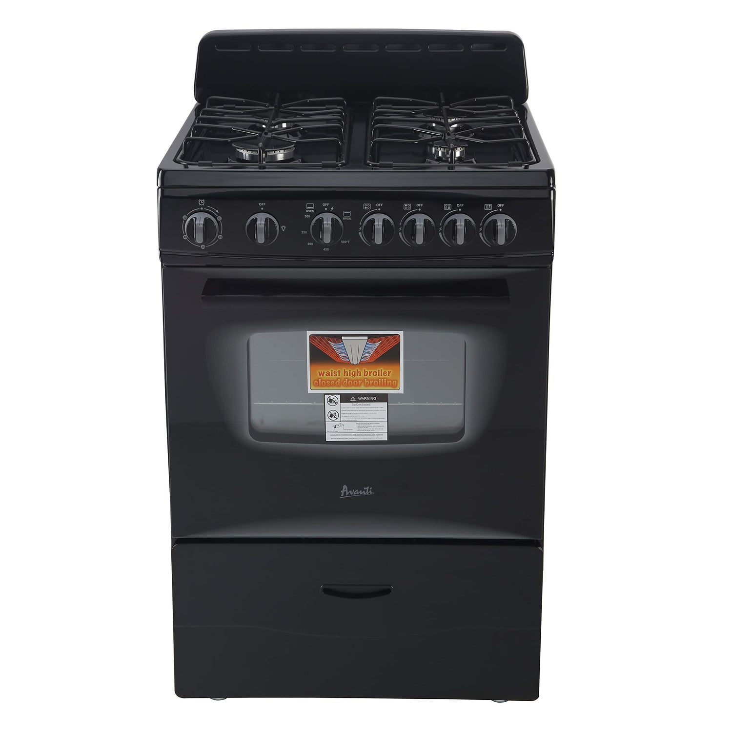 Details: Save kitchen space with this compact range from Avanti. The perfect compact gas range for the office, studio apartment, RV, tiny home, condo, vacation home, or anywhere you need to save space in a small kitchen. This 24-inch wide range features 4 sealed burners (1 rapid, 2 semi-rapid, and 1 simmer). The oven has a storage drawer at the bottom and a broiler that comes with a broiling pan.