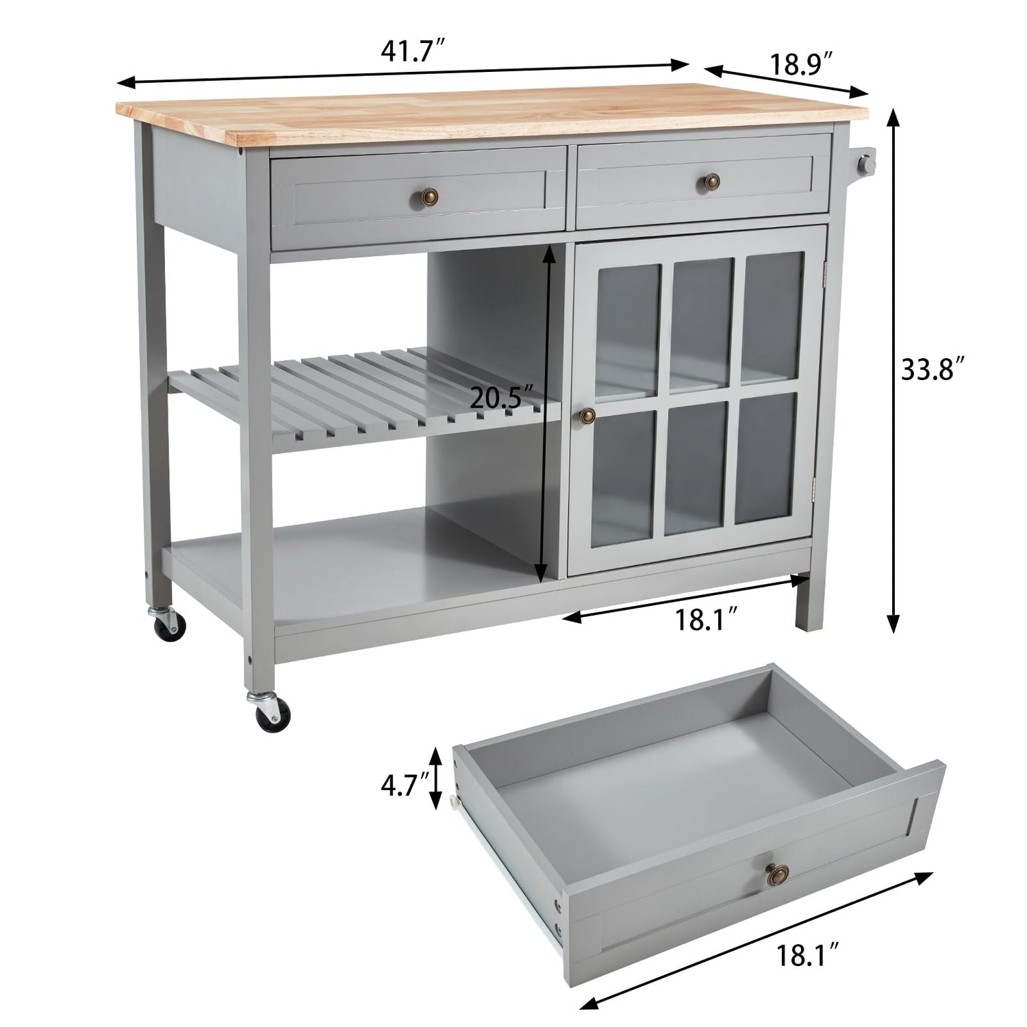 - 【Spacious Kitchen Island Storage】Simple and practical rolling kitchen cart provides more storage space for your small kitchen island. With 2 drawers, a towel rack, open display shelf provide you with a large storage space for your vegetables, fruits, drinks, and other kitchen necessities. Wood kitchen countertop expands your kitchen space. The kitchen island cart size is 41.7"L x 18.9"W x 33.8"H.