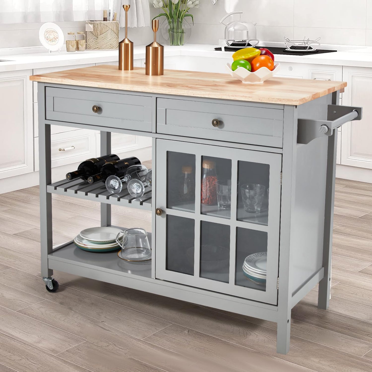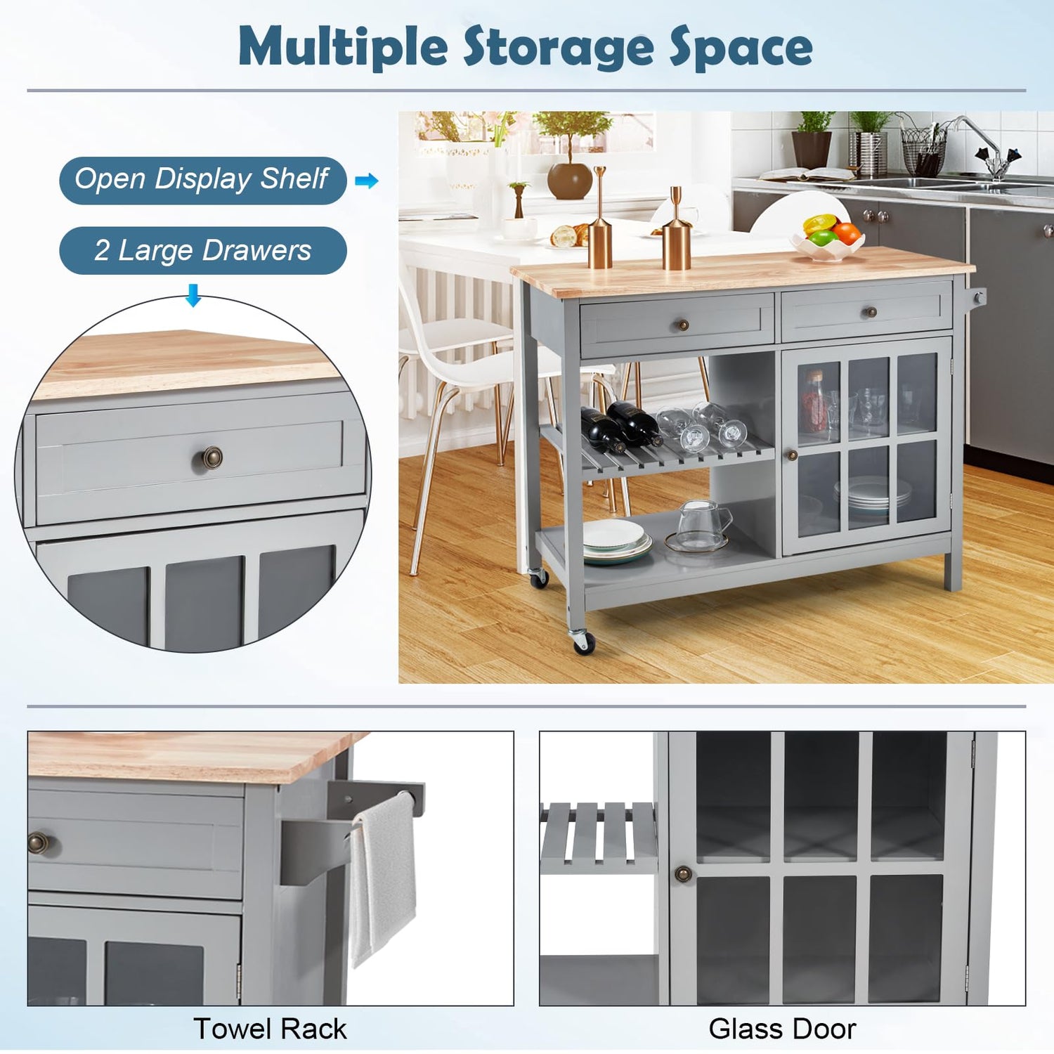 AVAWING Rolling Kitchen Island Cart with Storage, 42" Width Kitchen Cart w/ 2 Wheels, Coffee Cart with Drawers & Openshelves & Glass Cabinet & Towel Rack, Portable Islands, Grey