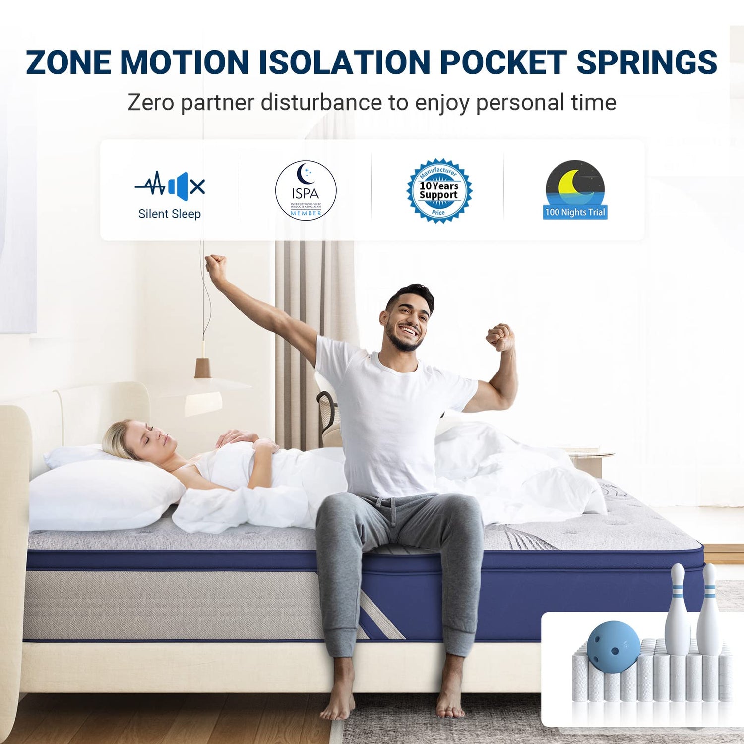 - Quiet and Cooling: The coils of the king size mattress are all wrapped in a pocket independently. In this way, there will be less motion transfer brought by our partner. Another, pocketed coils design can also keep the 10 inch mattress king hybrid with good air permeability and avoid overheating. Gel-infused memory foam is added below the top fabric. With the motion isolation structure and the cooling material we will enjoy a quiet and cooling night.