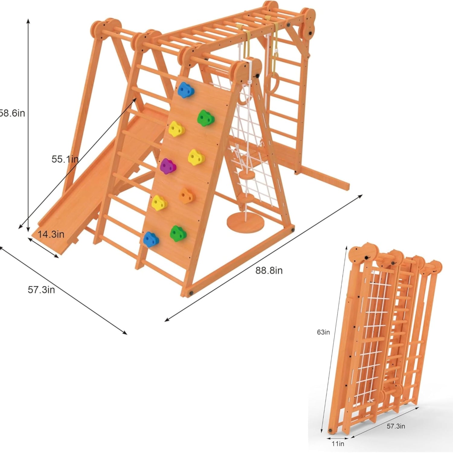 - 8-IN-1 INSIDE & OUTSIDE PLAYSET – This indoor/outdoor jungle gym for toddlers includes a safe toddler slide, monkey bars, ladder, rope ladder, rock climbing wall, flat seat swing, gymnastics rings, and disc seat swing. Dimensions: 59" H x 57" W x 82" L with monkey bars extended (46" L when folded in).