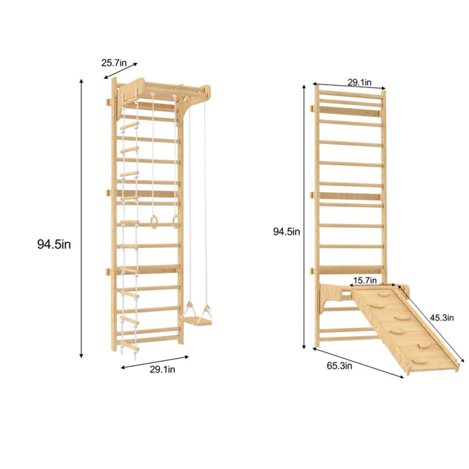 Details: Introducing the Betula Playground Set Swedish Climbing Wall Ladder and Slides for Kids, a modern and versatile addition to elevate your space effortlessly. Crafted from high-quality Betula wood, this climbing toys for toddlers is more than just a piece of furniture – this toddler jungle gym indoor is a stylish fusion of play, fitness, and organization. The sturdy construction of our soft play climbing for toddlers ensures durability for all activities. Designed for ninja kids, this toddler climbing toys promotes physical development, coordination, and motor skills. With features like the Swedish Ladder Swing, Rope Ladder, and Kids Slide, it fosters a fun and active lifestyle. Let your little ones climb, swing, and use our kids slide indoor as their way to a healthier, happier childhood. But it's not just for the kids! Adults can join the fun too, thanks to the Adult Pull-Up Bar that comes with our indoor kids gym. Enjoy the benefits of strength training and overall well-being in the comfort of your home. The Betula Swedish Wall Ladder Toddler Climbing Toys Indoor is where playfulness meets functionality, offering a seamless blend of entertainment and fitness for the entire family. Upgrade your space with this unique piece that brings joy and health together.