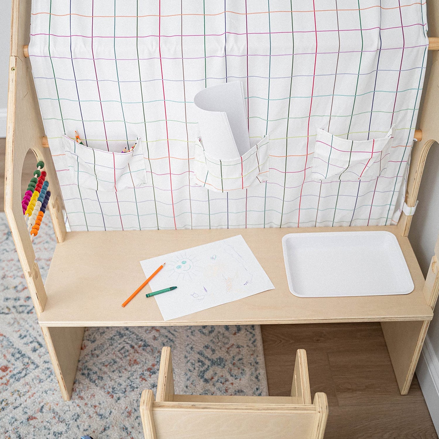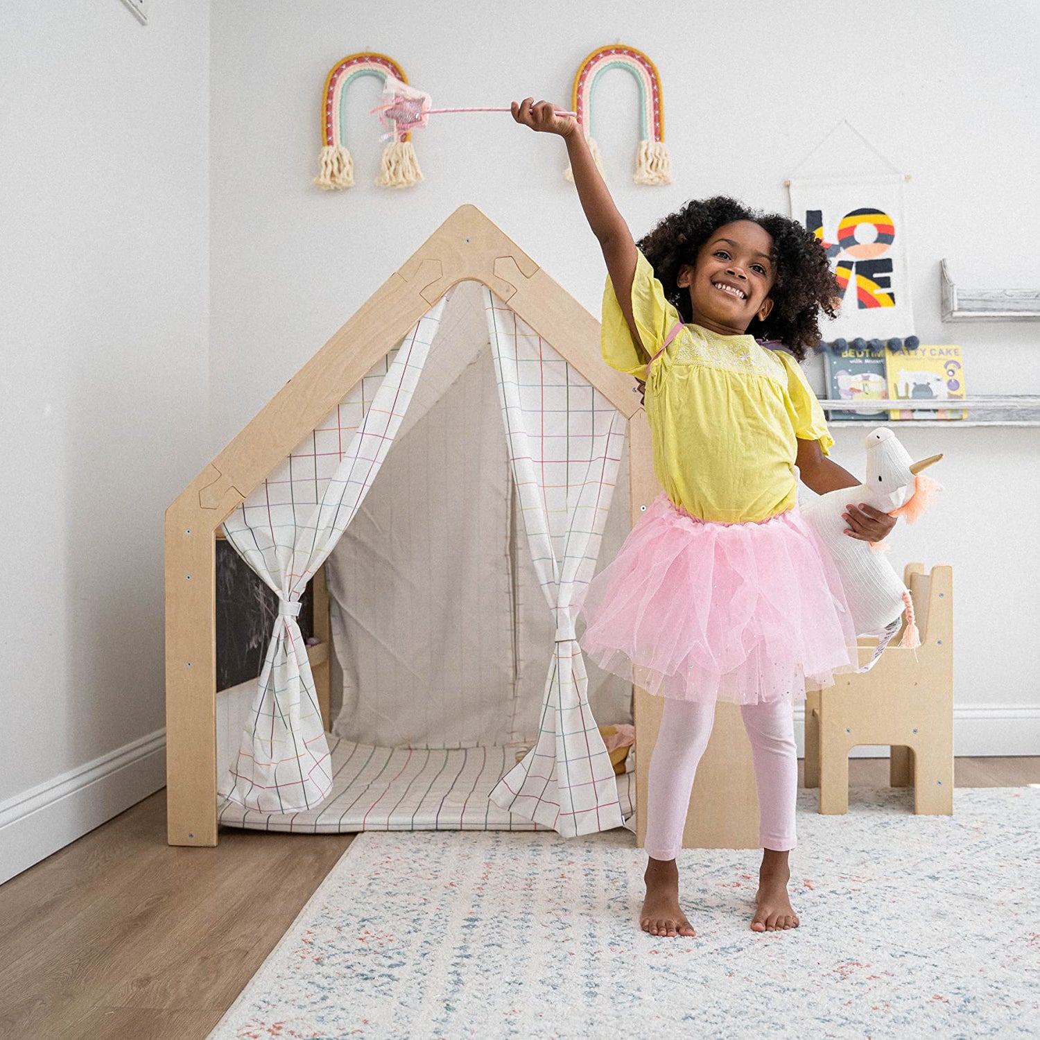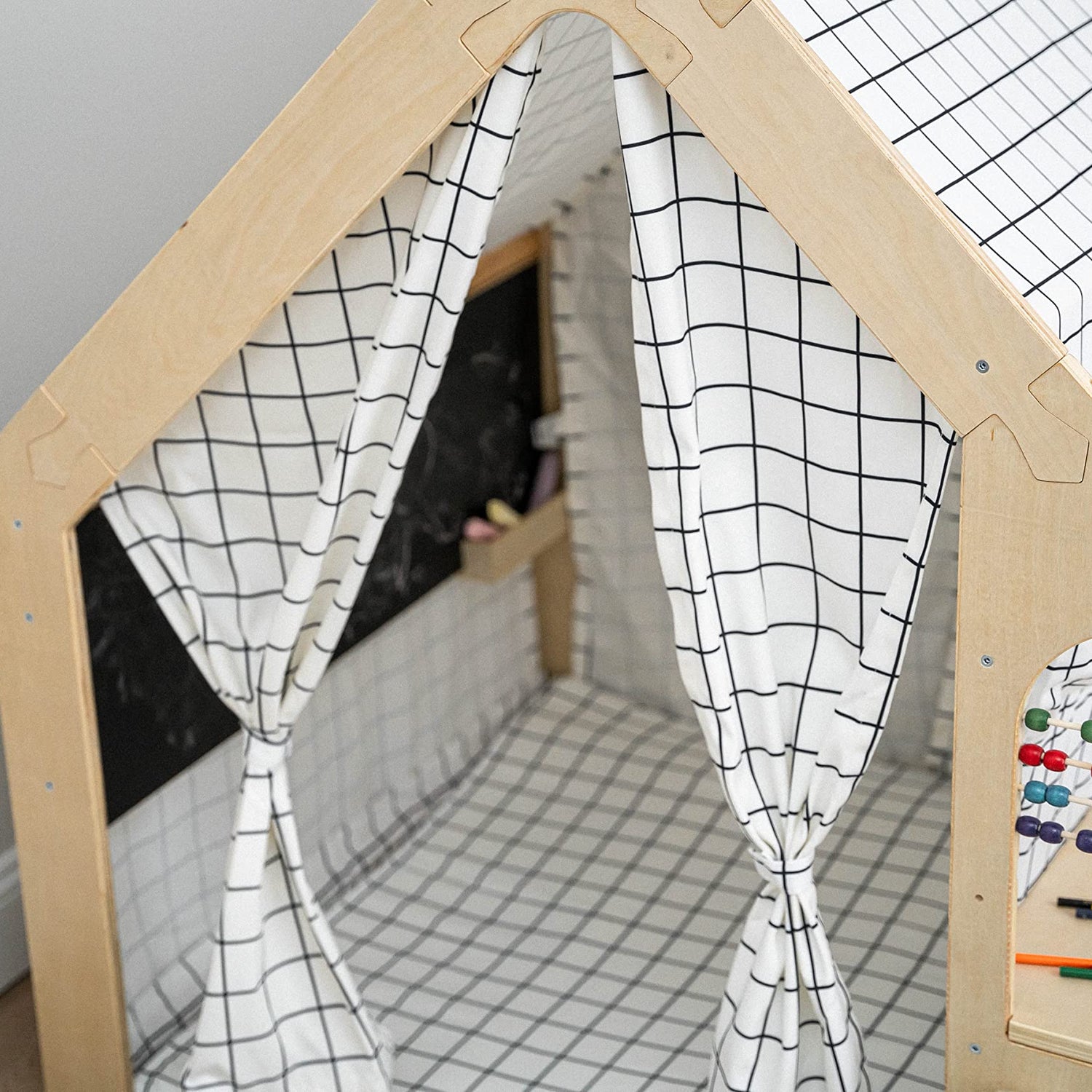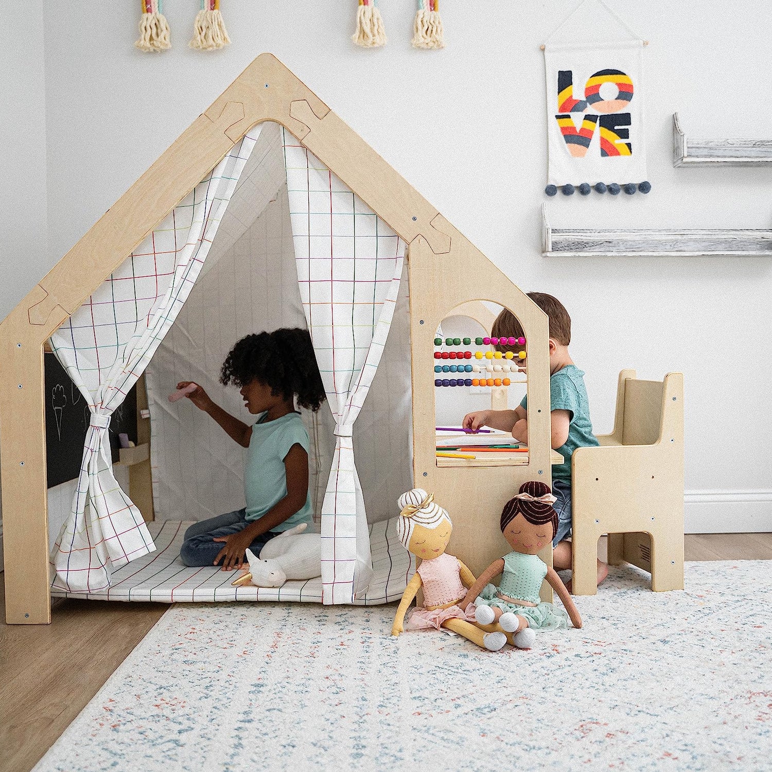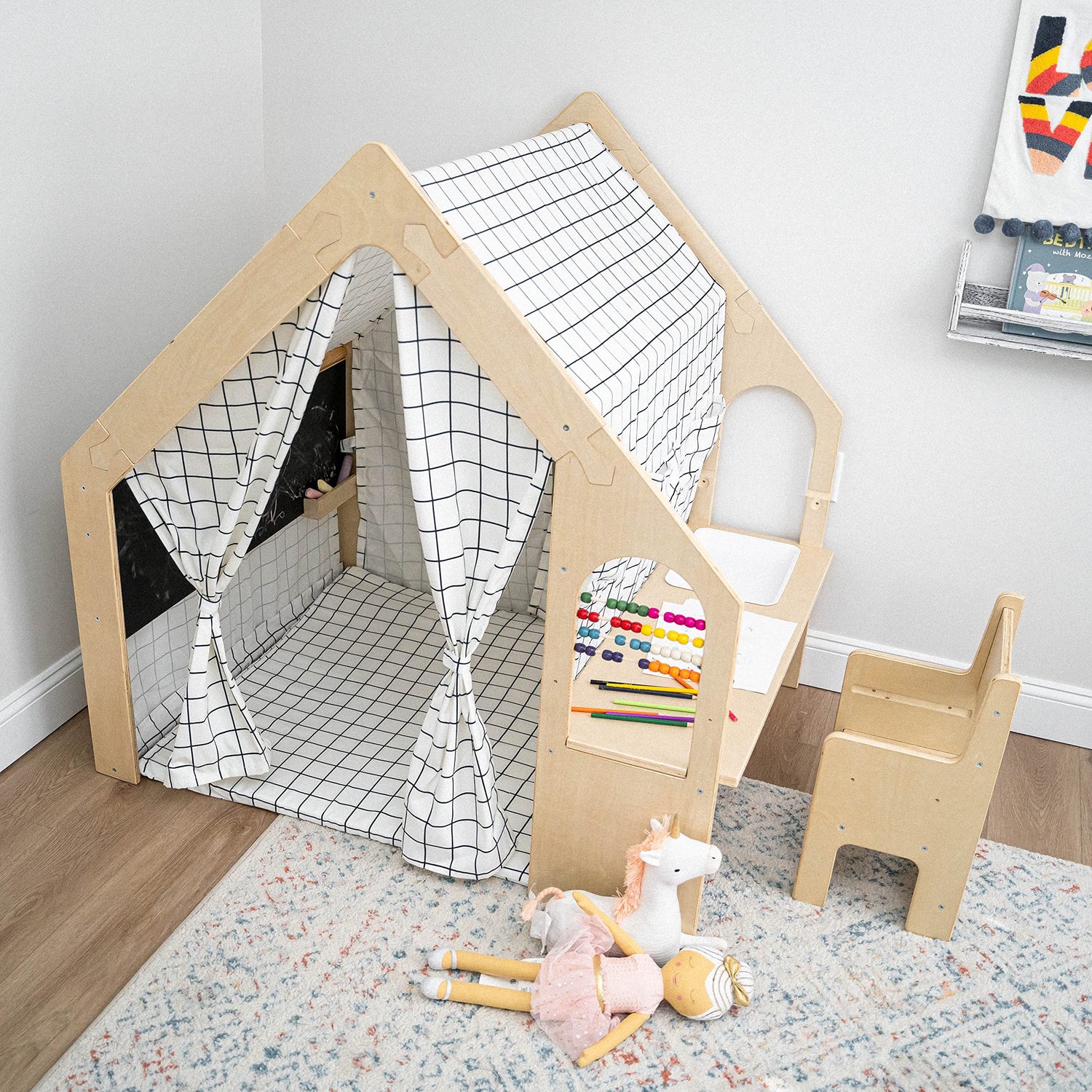 Avenlur Flair Montessori Style Wooden 5 in 1 Indoor Playhouse Play Tent with Desk Table, Chair, Chalkboard, Floor Cushion and Curtain Shades for Babies, Toddlers, Kids (Large, Windowpane)