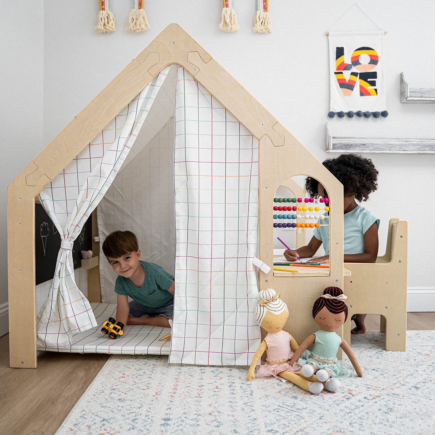 - Playhouse for Boys and Girls: This 5-in-1 kids wooden playhouse combines a tent, desk, chair, chalkboard, and floor cushion, providing a versatile and engaging play space for children ages 1 to 8 years.