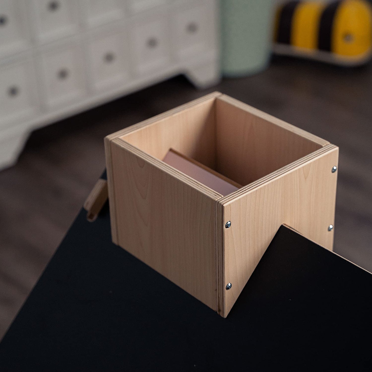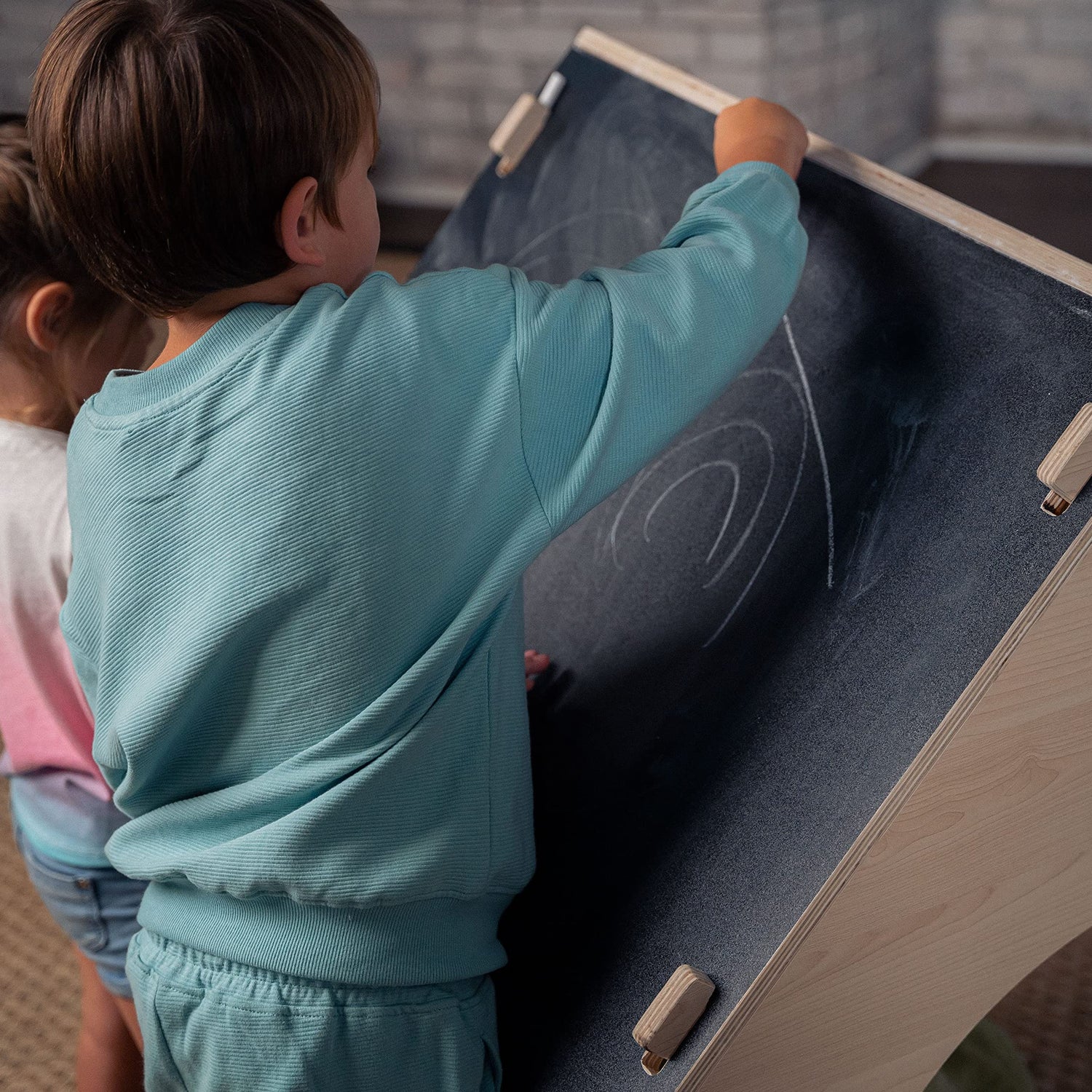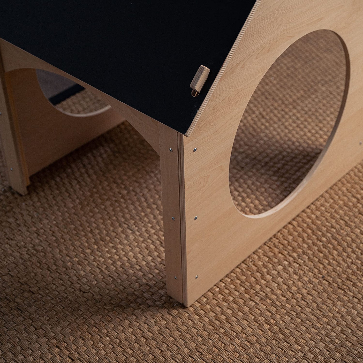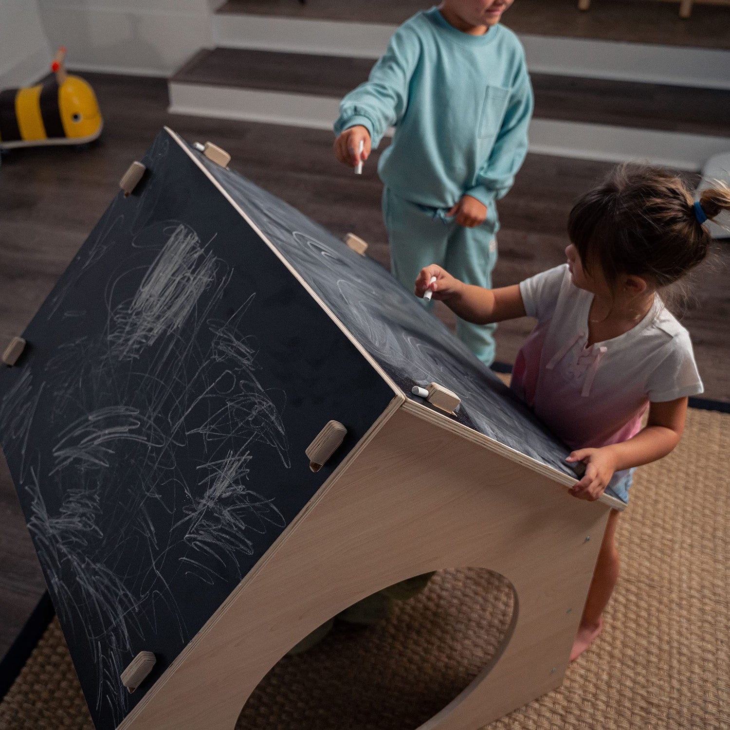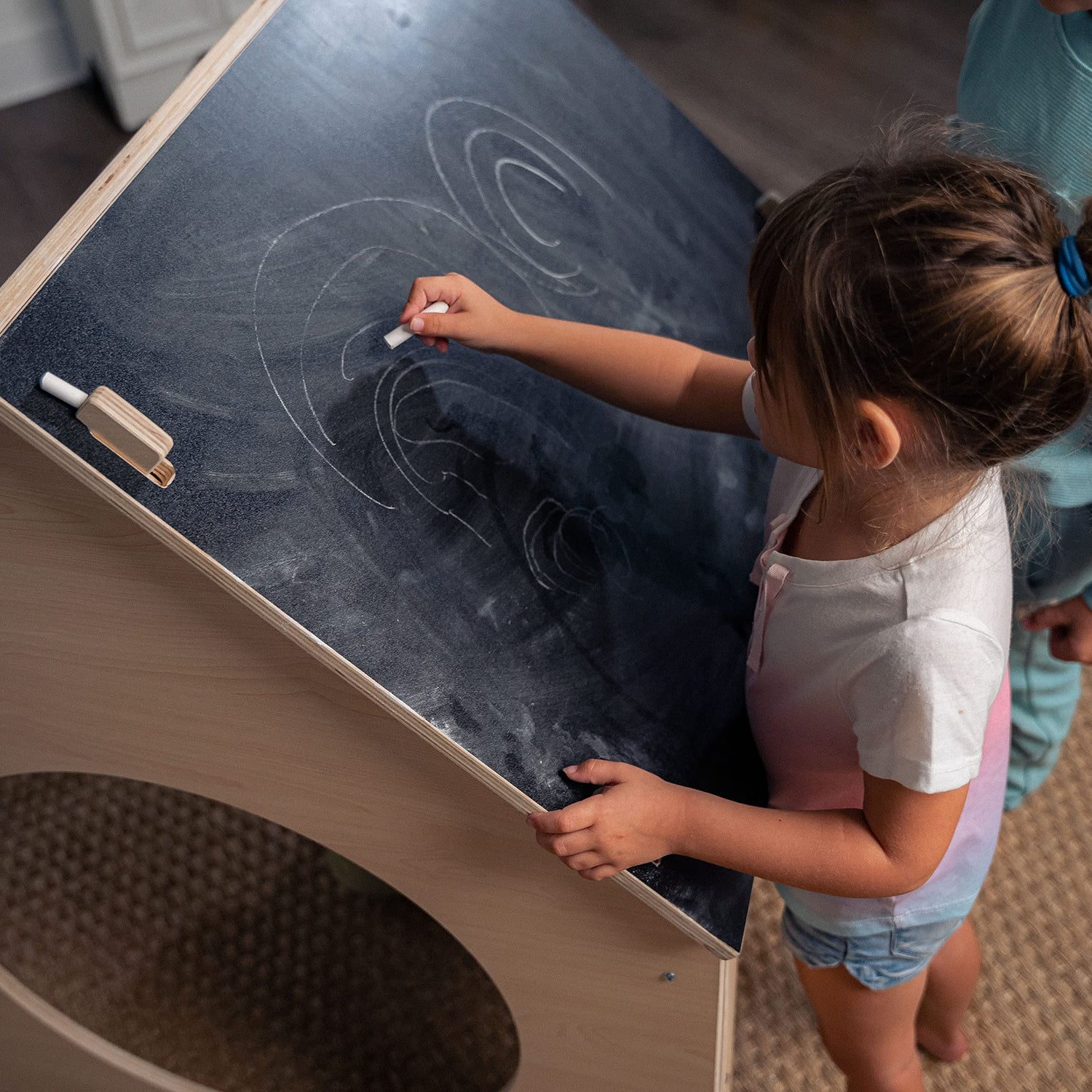 - This modern playhouse table encourages creative expression & imagery play. It has many uses; It's a Playhouse, Easel & Art Table. Both surface tops are reversible; Chalkboard on one side & a solid white finish on the other, making it ideal for painting & drawing. The raised edge on the white side is handy for resting craft books & paper while the chimney is the perfect place to store pencils, crayons & chalk.