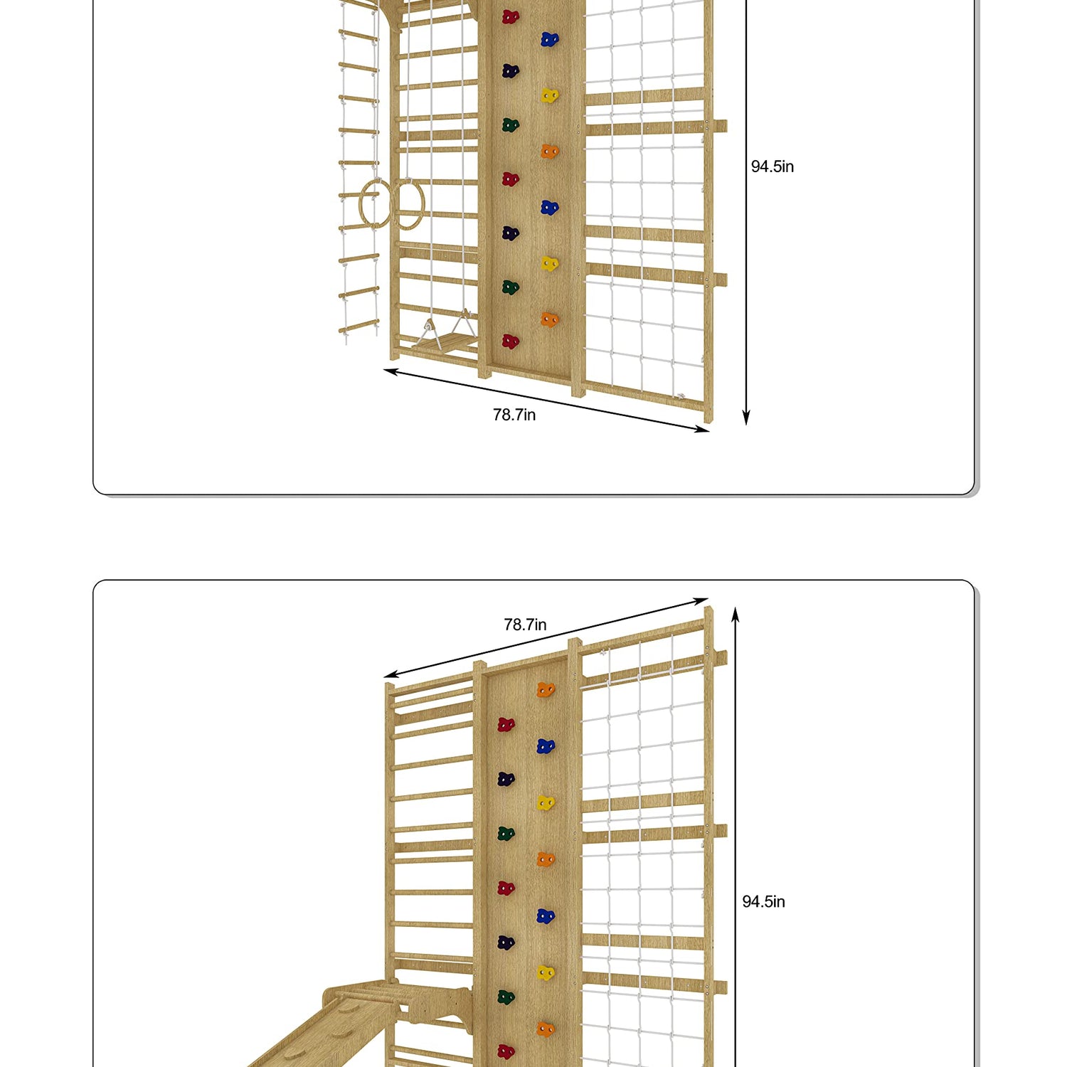 - Versatile Climbing Gym: Explore countless adventures with this all-in-one indoor wooden jungle gym! With two height options (94.5" and 79"), it suits any space perfectly. Designed to spark exploration and play, it boasts a trapeze swing, rope ladder, rock wall, ramp climber, slide, pull-up bar, and more. Keep kids engaged and active for hours!