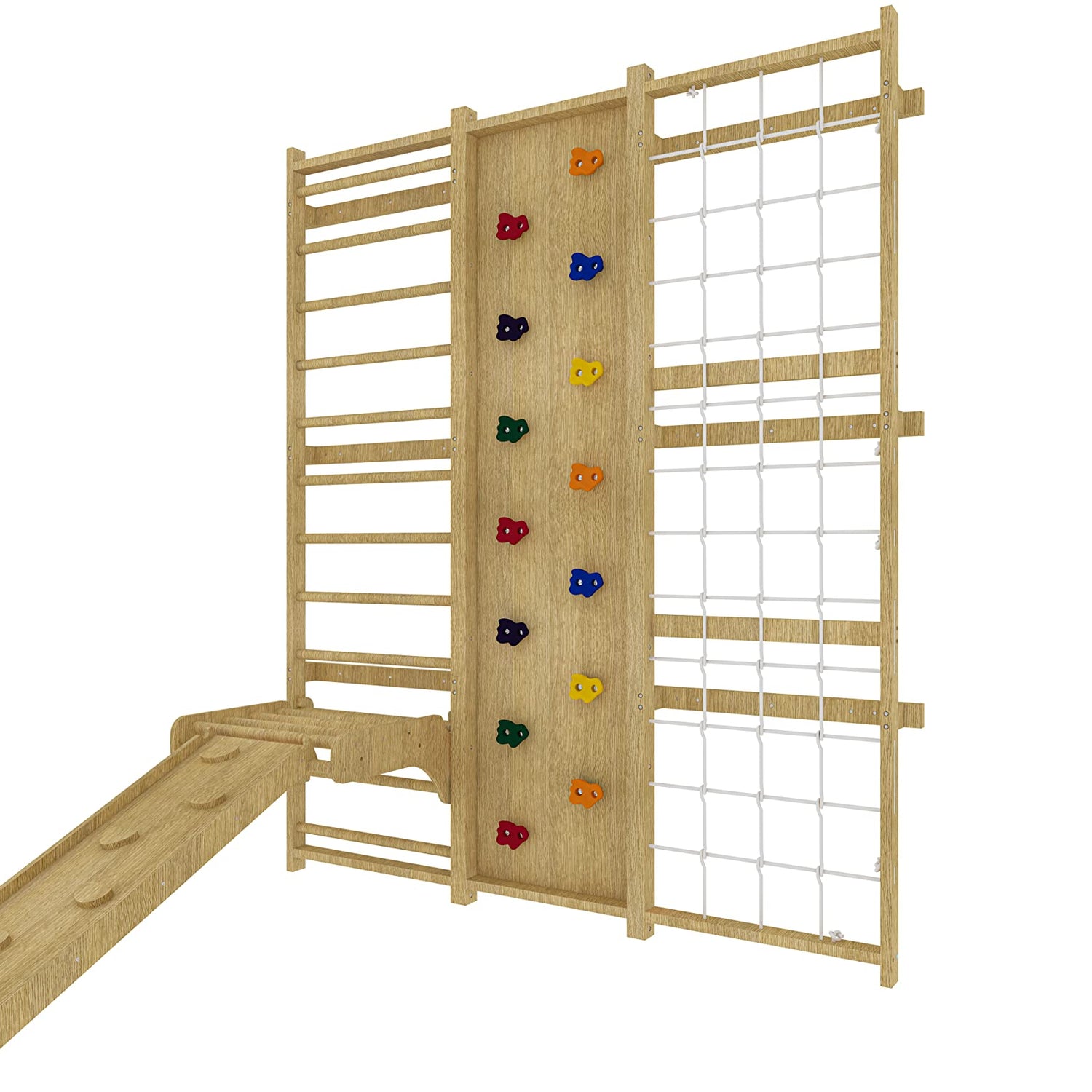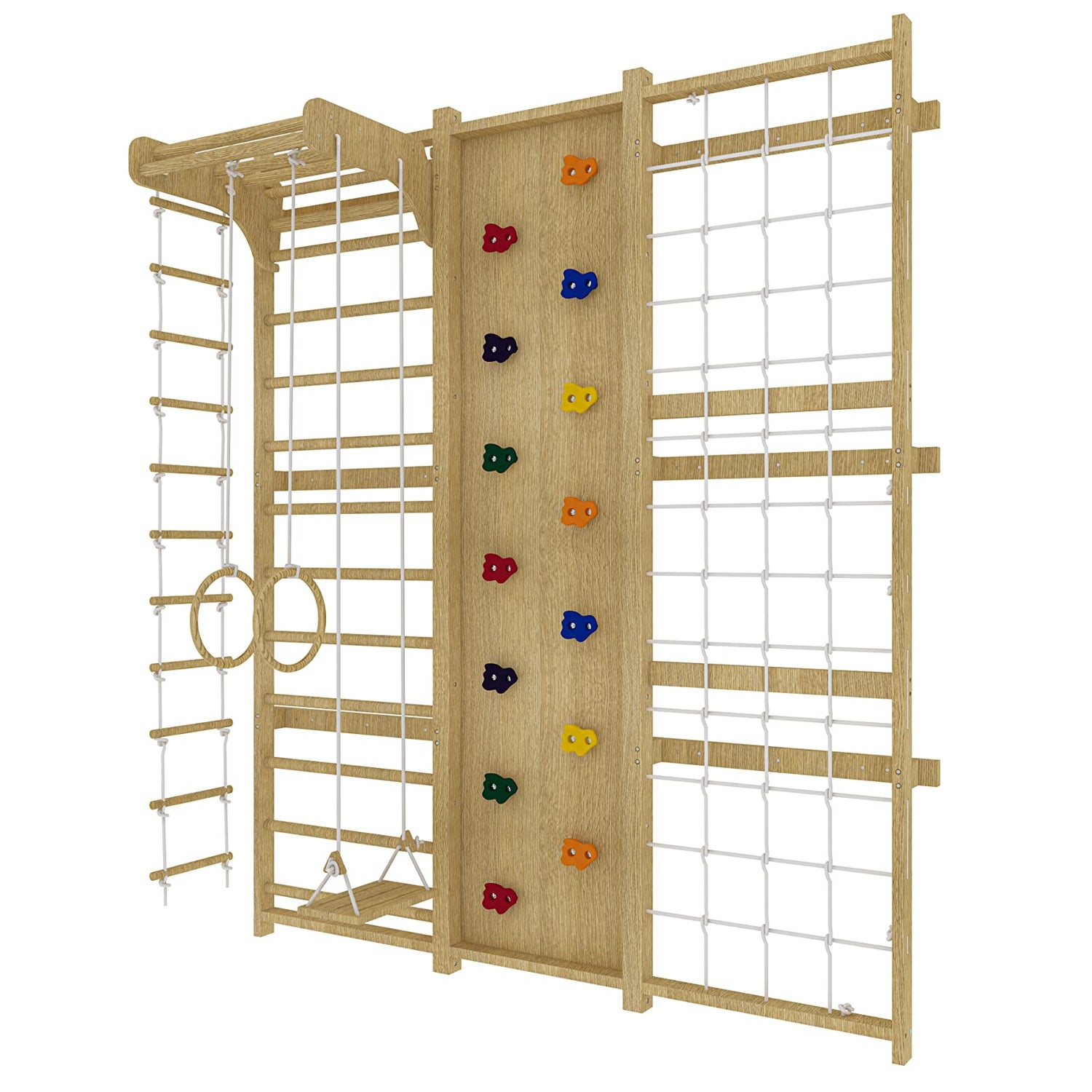 Details: 9-IN-1: Indoor Wooden Swedish Ladder Wall Gym Set, Rock Climbing, Trapeze, Pullup Bars, Swing, Rope Climb, Net Climber, Convertible Slide Indoor Montessori Waldorf Playground Gymnasticsffor Kids, Teens and Adults.