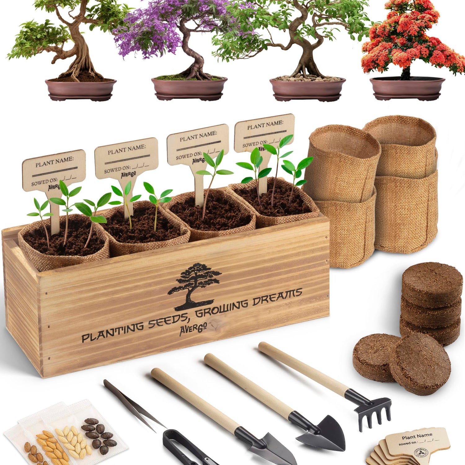- COMPLETE BONSAI STARTER KITS – Avergo’s DIY total bonsai kit for beginners contains everything you need to grow your special mini trees
