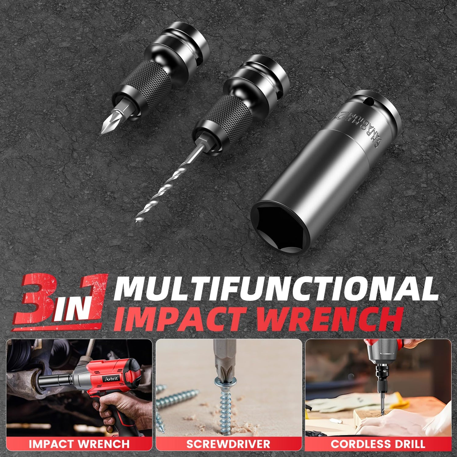 - 3-in-1 Power Impact Wrench for Multi-Scene Application: Avhrit 1/2 inch impact wrench set can be used not only as a 1/2 impact wrench for tightening or loosening wheel nuts in the car or motorcycle, commercial vehicles, and bolts on the door or wall, scaffolding installation, garage use, but also as an impact drill and power screwdriver for furniture assembling and other DIY hand working, etc.