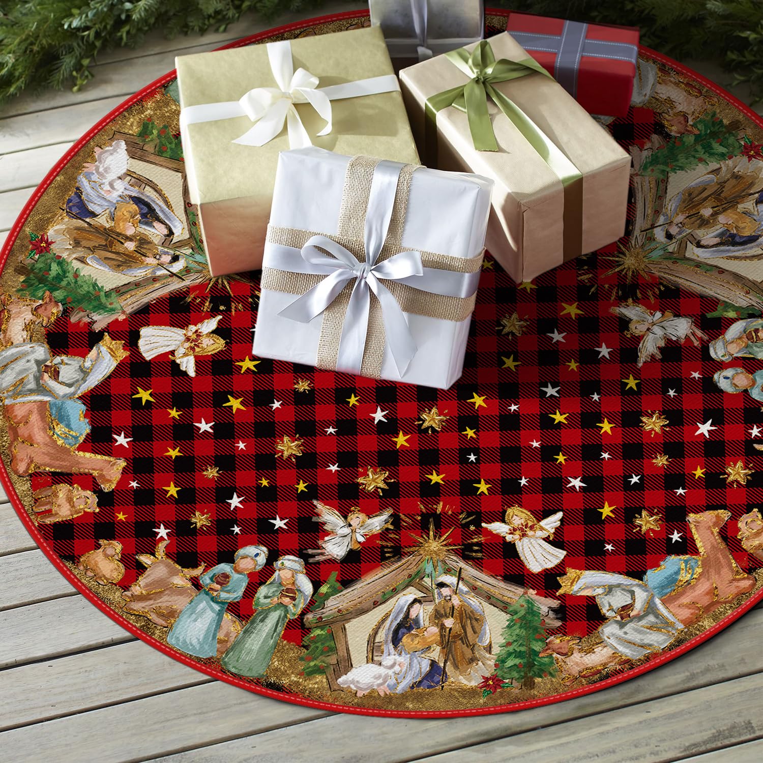 - EASY TO INSTALL: With an open design, it easily fits around the base of the Christmas tree, and drawstrings keep the skirt from slipping or shifting.