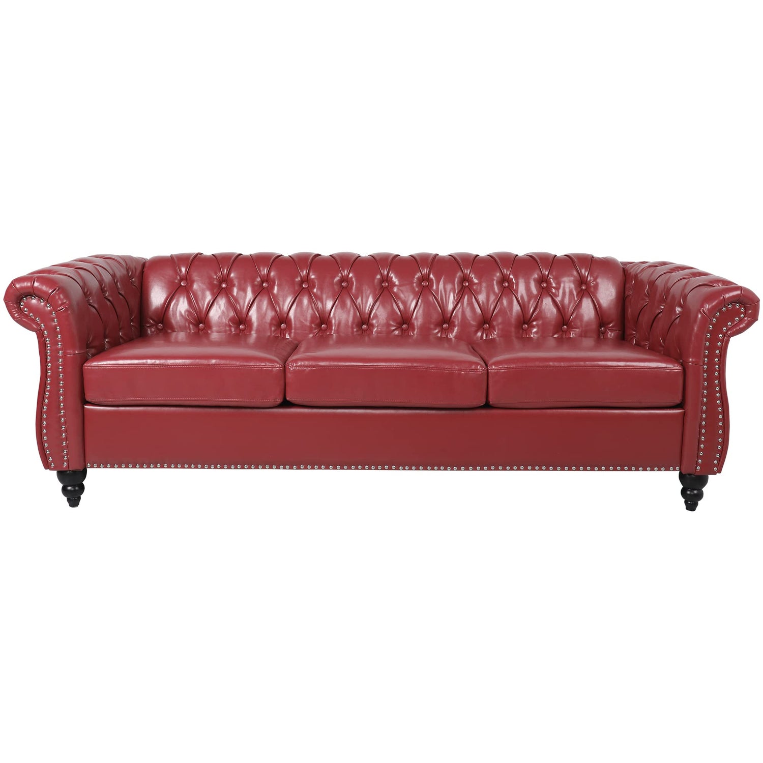 AVZEAR Leather Sofa 3 Seater Couch, Large Sofa Furniture Roll Arm Classic Tufted Chesterfield Settee Leather Sofa with Channel Tufted Seat Back for Living Room, Claret