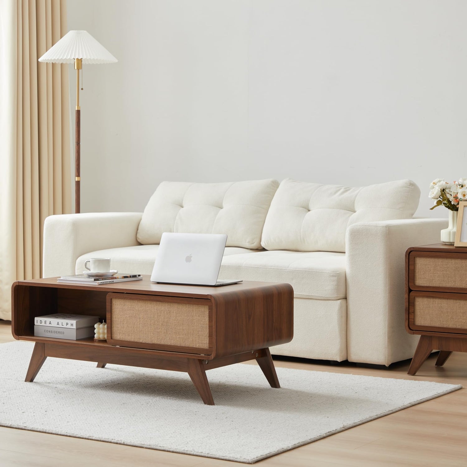 AVZEAR Mid Century Modern Coffee Table with Storage, Farmhouse Coffee Table Accent Center Tables with Sliding Linen Door Panel, Dining Table Centerpiece Decor Wood Coffee Table for Living Room, Walnut