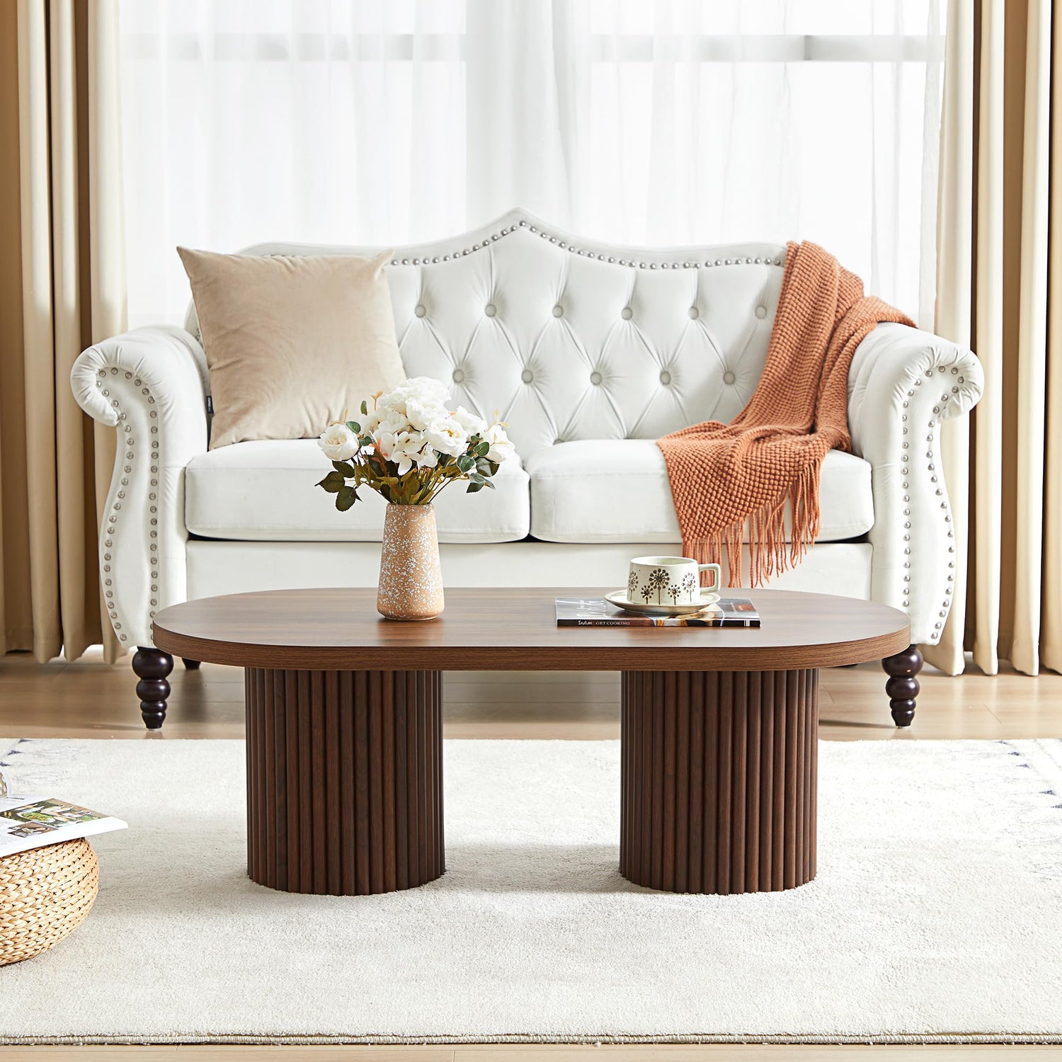 - Elegant Fluted Coffee Table: This oval coffee table seamlessly blends timeless aesthetics with contemporary functionality. The wooden tabletop features a beautifully curved design, complemented by unique fluted cylindrical legs, adding depth and sophistication to your home. The vintage walnut finish enhances its retro charm, adding warmth and style to your space.