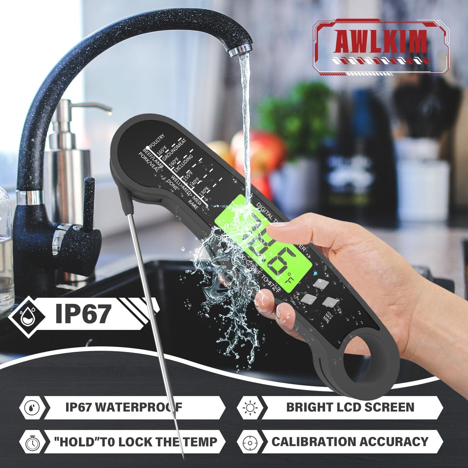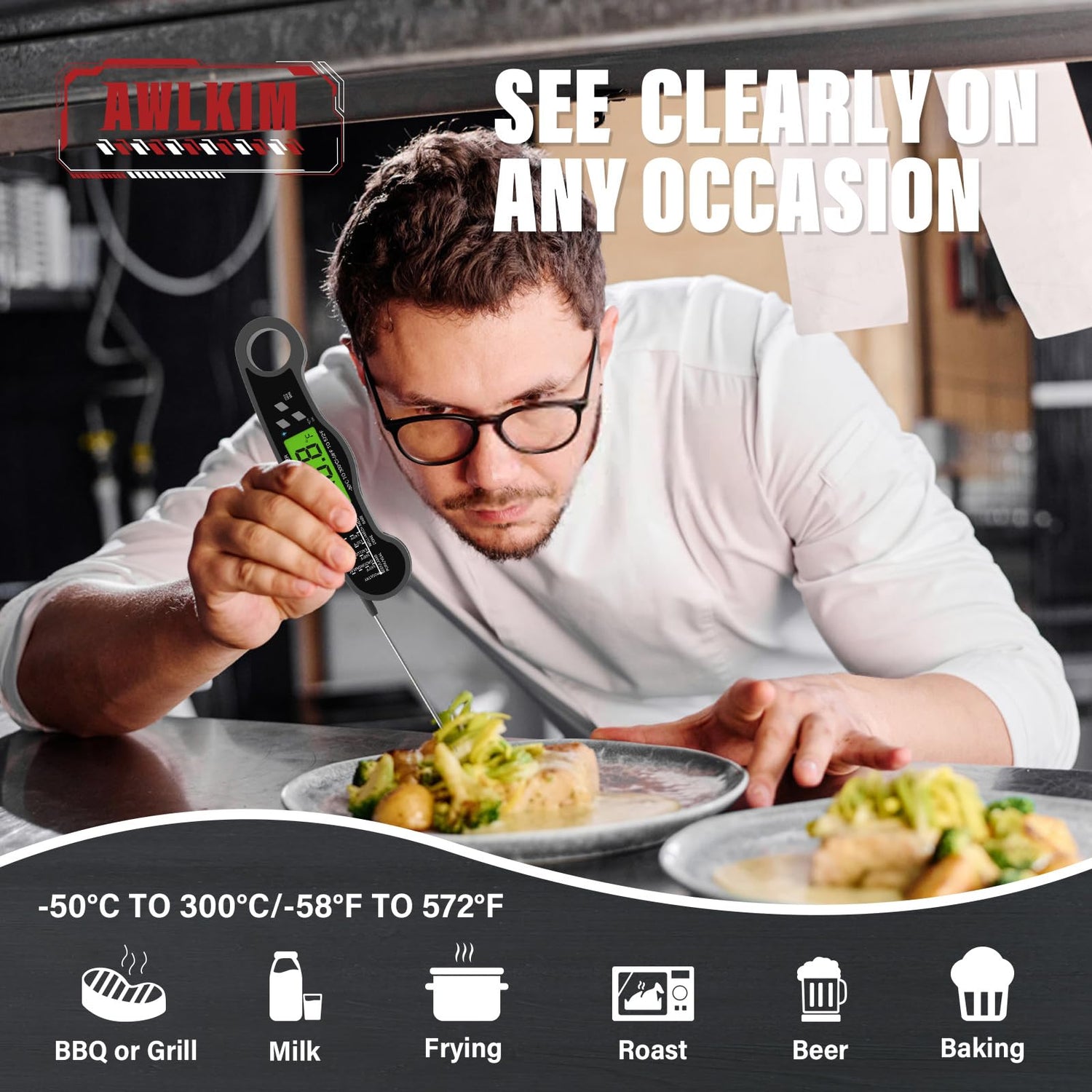 AWLKIM® Instant Read Meat Thermometer Digital - Waterproof Food Thermometer with Backlight for Cooking, Grill, Candy, Kitchen & Stocking Stuffers for Men - Grey