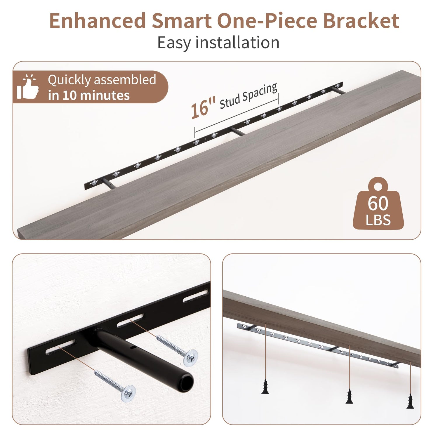 - Smart Mounting System: Our storage shelves have a heavy-duty hidden bracket that can be easily installed into wall studs, with each floating wall shelf capable of holding up to 60 lbs. The flush mount design ensures that the metal brackets are invisible after installation, while screws at the bottom secure the floating shelves from sliding off