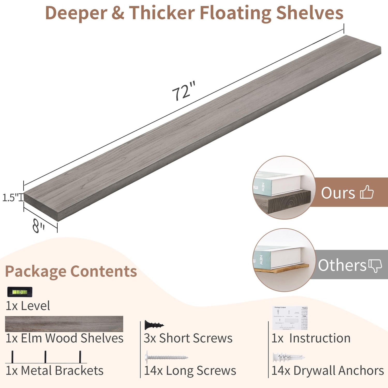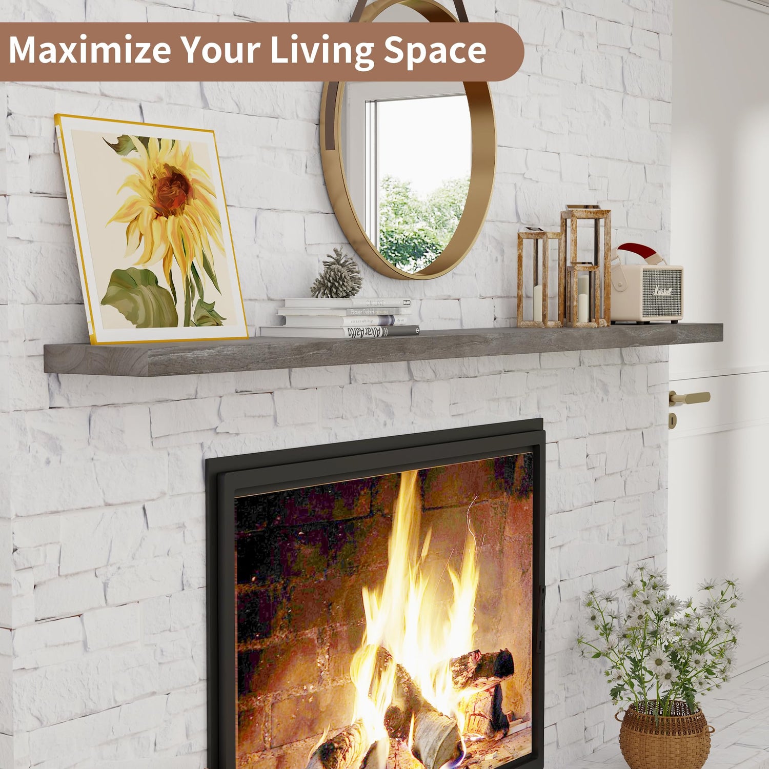Axeman 72 Inch Fireplace Mantel Shelf - 8 Inch Deep Rustic Solid Elm Wood Floating Shelf, Wall Mounted Farmhouse Display Shelf with Invisible Heavy Duty Metal Bracket, Grey