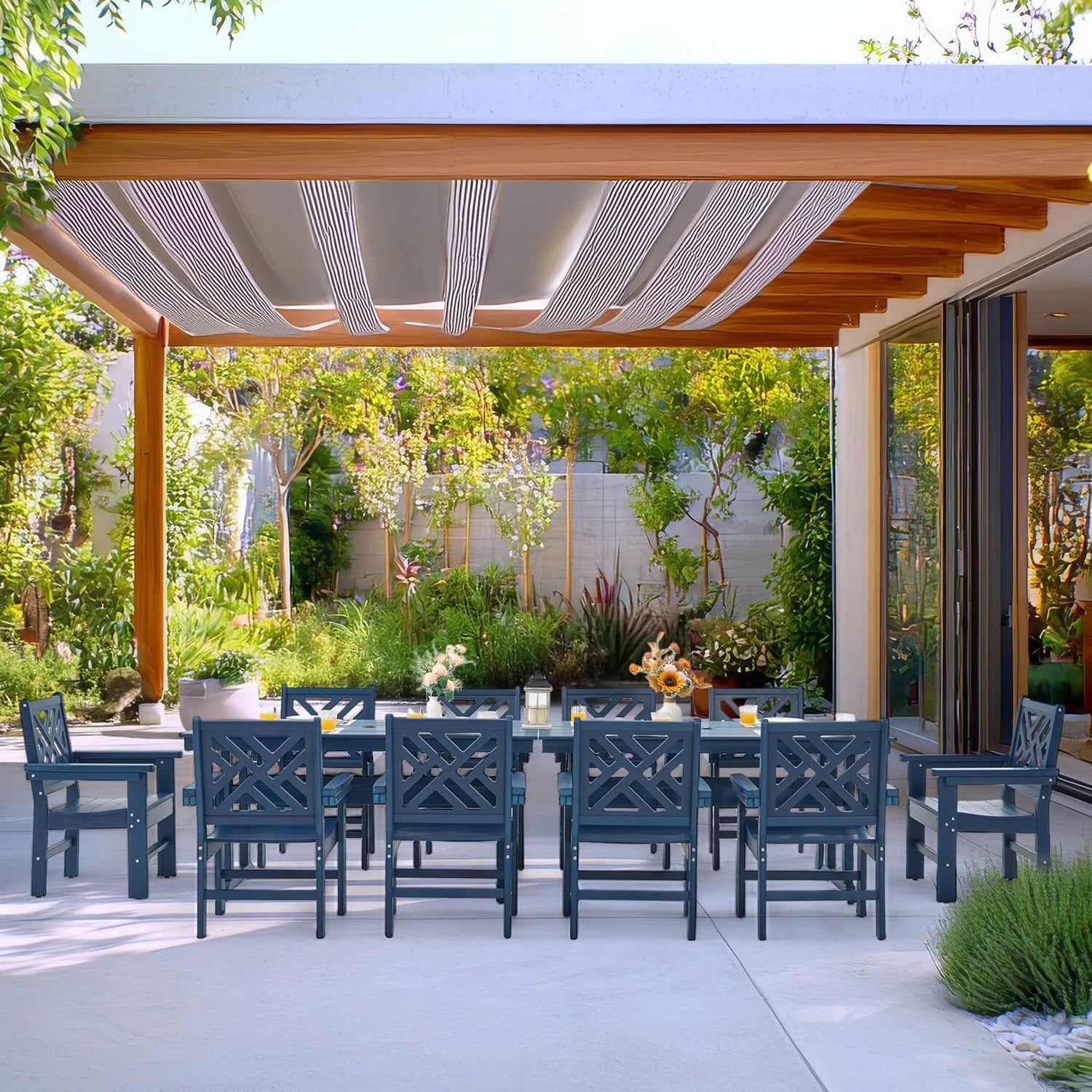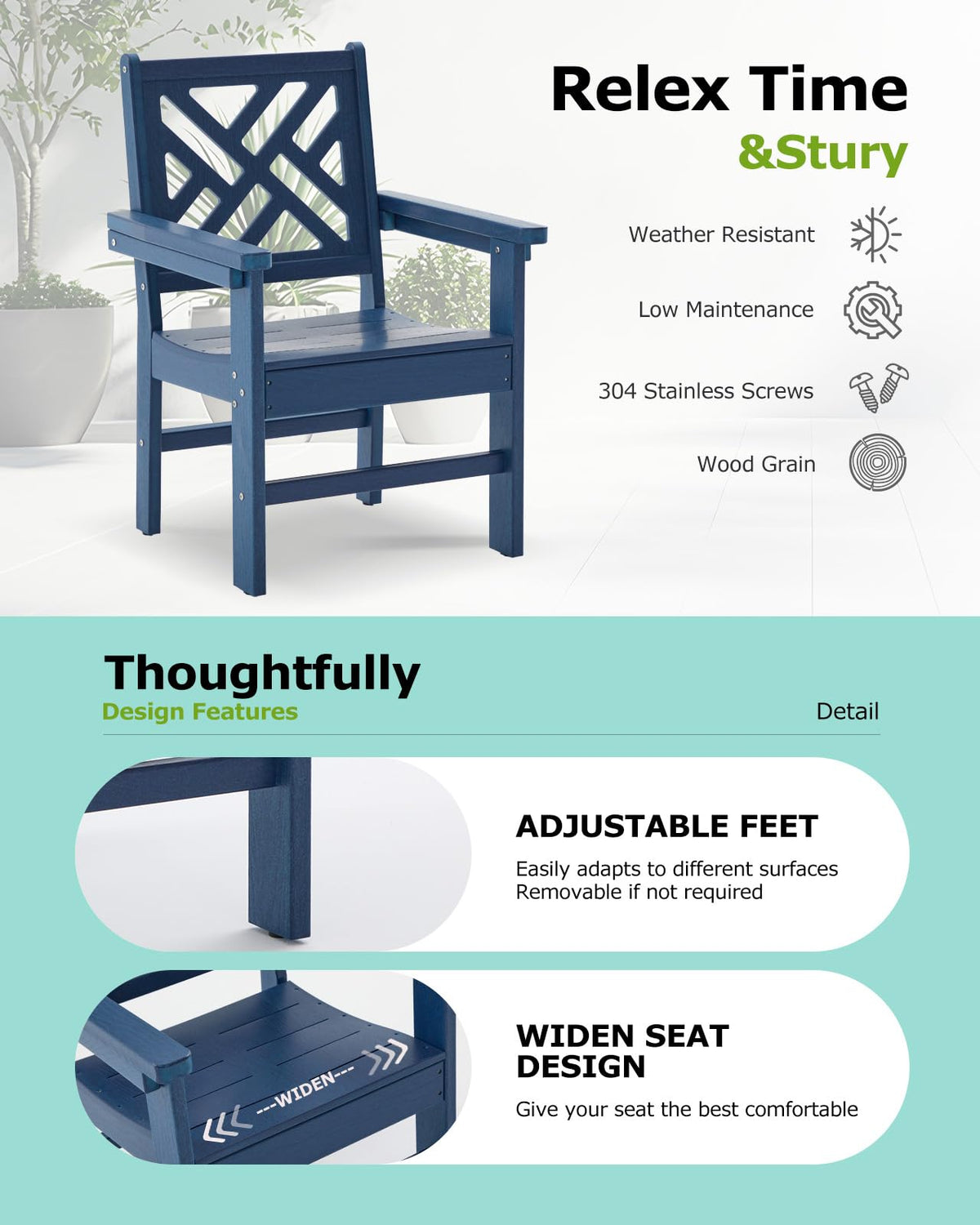 - 【Exquisite 12 Piece Dining Set】 Enhance your outdoor space with this 12 piece HDPE outdoor dining set. Its unique Fretwork chair back design brings a touch of elegance, setting this patio furniture set apart. Its exquisite design blends seamlessly with any garden or patio setting.