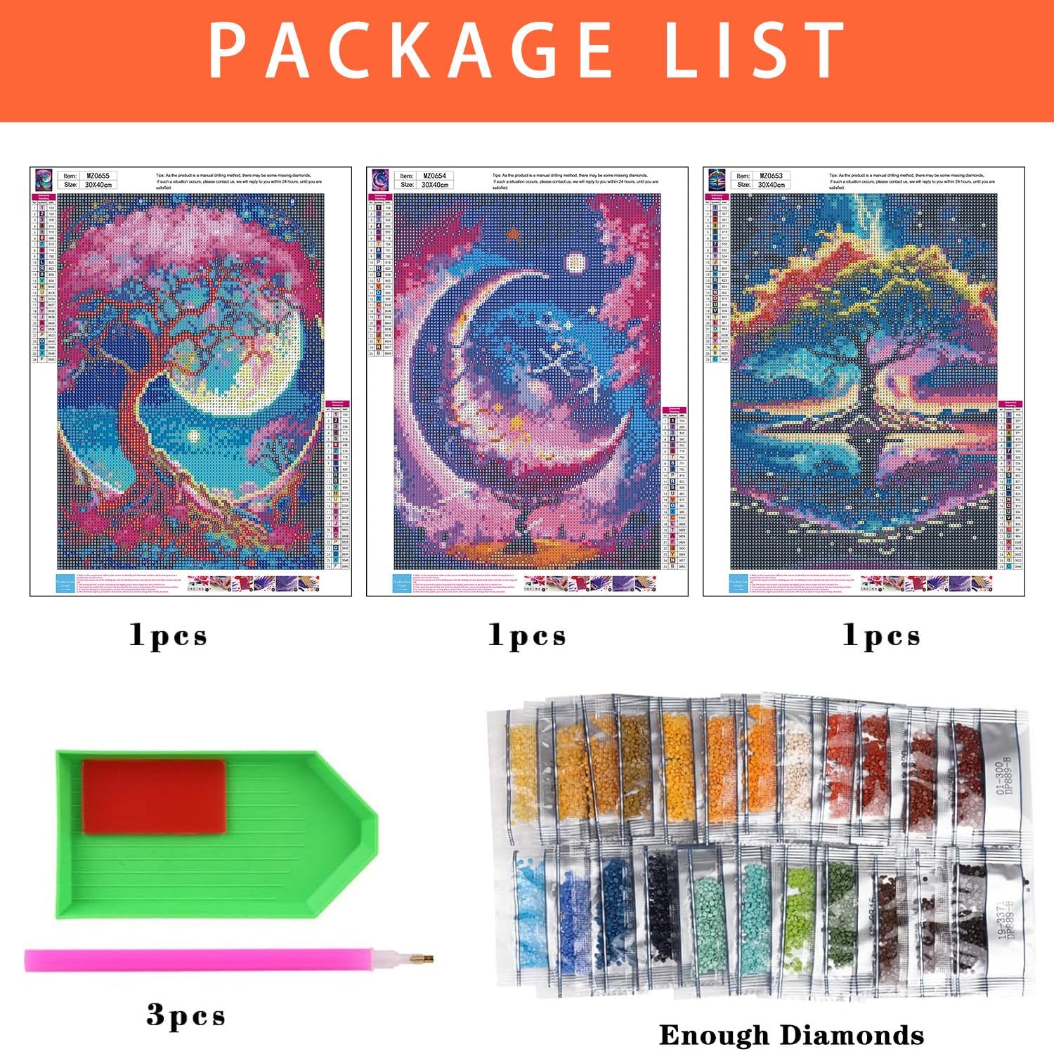 - 【5D Diamond Painting Kits for Adults】3 pack tree of life diamond painting, 3*point diamond pen, 3* diamond tray, 3*red glue clay, several plastic bags to store the diamonds, enough colorful round diamonds, we'll provide 30% diamond more than need.