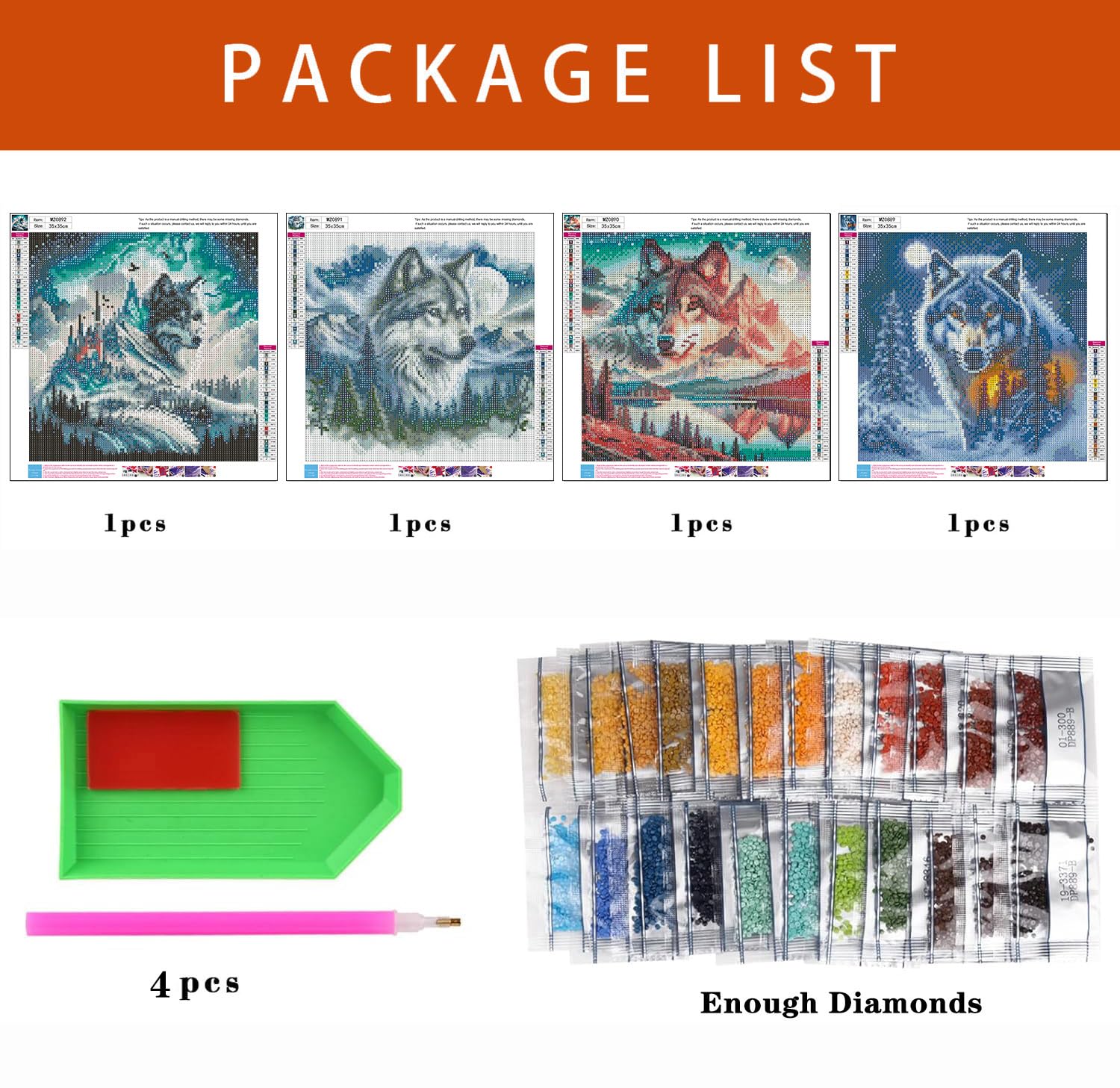 - Diamond Painting Size and Package: Including 4×high definition 10x14in painting canvas, 4×point diamond pen, 4×craft tray, 4×clay, 40×self-sealing bags. Don’t worry about the lack of diamonds. We will add 30 percent to each color of diamond. Note: The frame is not included.