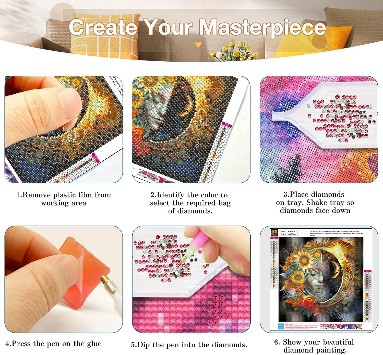 - High-Quality Materials: Sun and moon diamond painting kits use high-quality pure natural resin materials.The canvas is high clear printing and water-proof,the symbols is easy to read.The pattern itself has a hot melt adhesive background and plastic protective film.And the diamonds won't fall down once they're pressed onto the canvas so that you could easy to complete the picture.It is light in texture,moderate in brightness,rich in color,will be never fade.