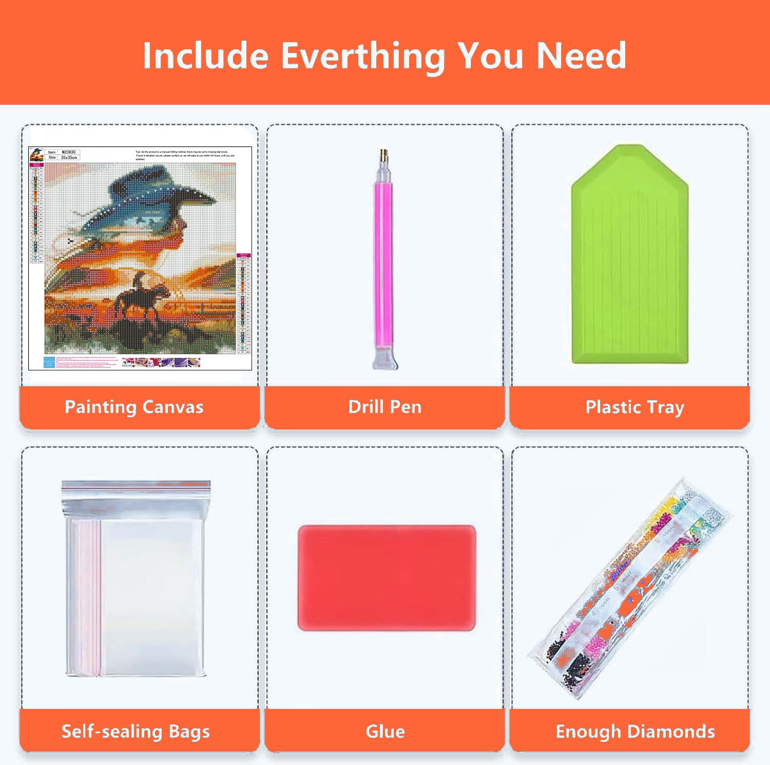 - 【5D Diamond Painting Kits for Adults】14x14in cowgirl diamond painting, 1*point diamond pen, 1* diamond tray, 1*red glue clay, several ziploc bags to store the diamonds, enough colorful round diamonds, we'll provide 30% diamond more than need.