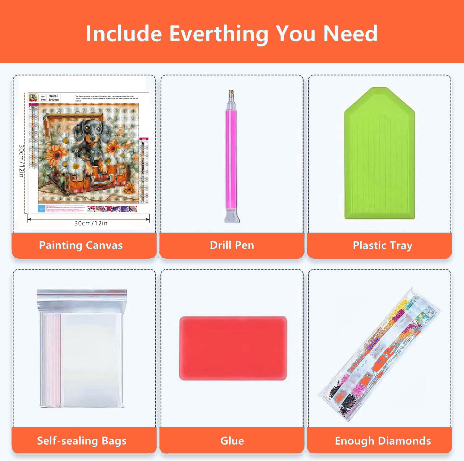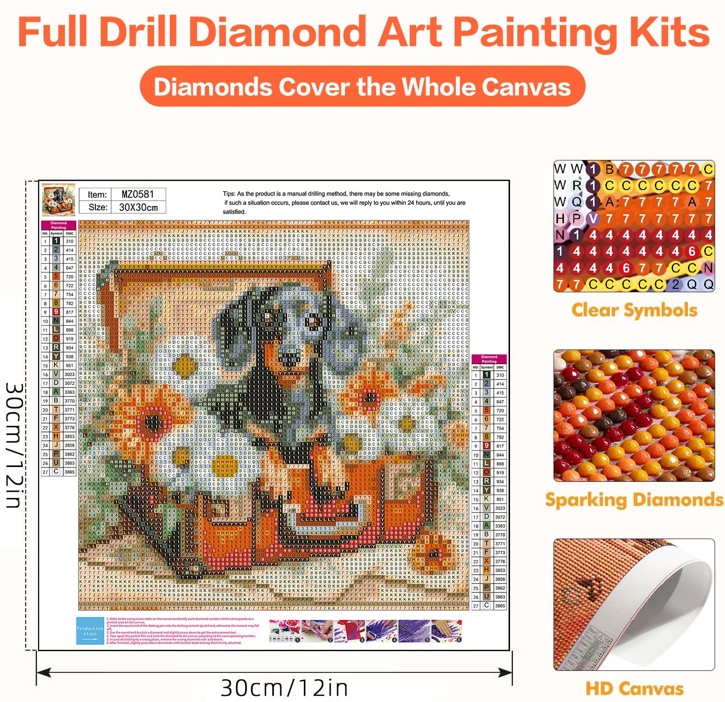- 【5D Diamond Painting Kits for Adults】12x12in dachshund diamond painting, 1*color coded rhinestones, 1*point diamond pen, 1* diamond tray, 1*red glue clay, several plastic bags to store the diamonds, enough colorful round diamonds, we'll provide 30% diamond more than need.