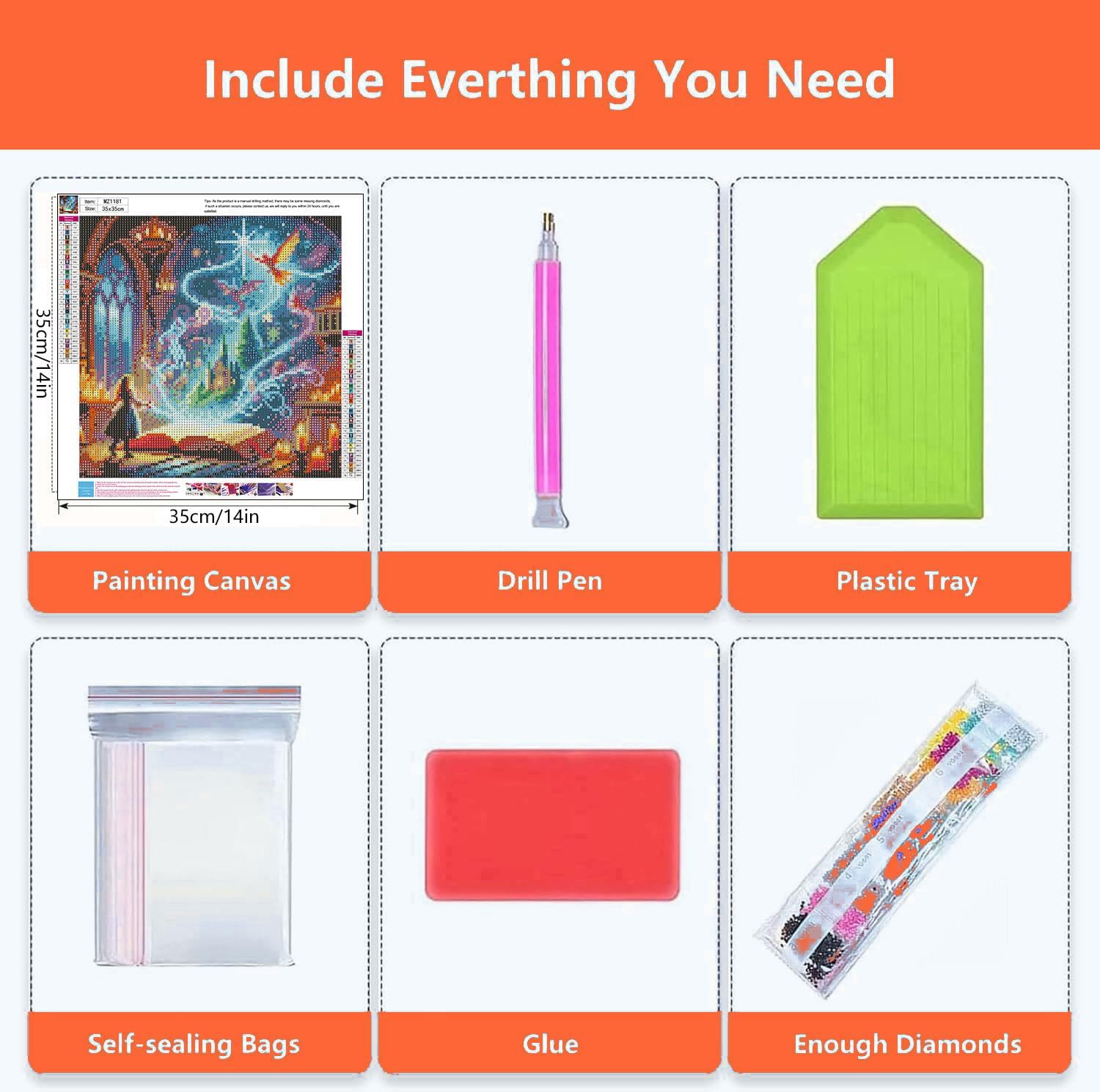 - 【5D Diamond Painting Kits for Adults】14x14in book diamond painting, 1*point diamond pen, 1* diamond tray, 1*red glue clay, several plastic bags to store the diamonds, enough colorful round diamonds, we'll provide 30% diamond more than need.