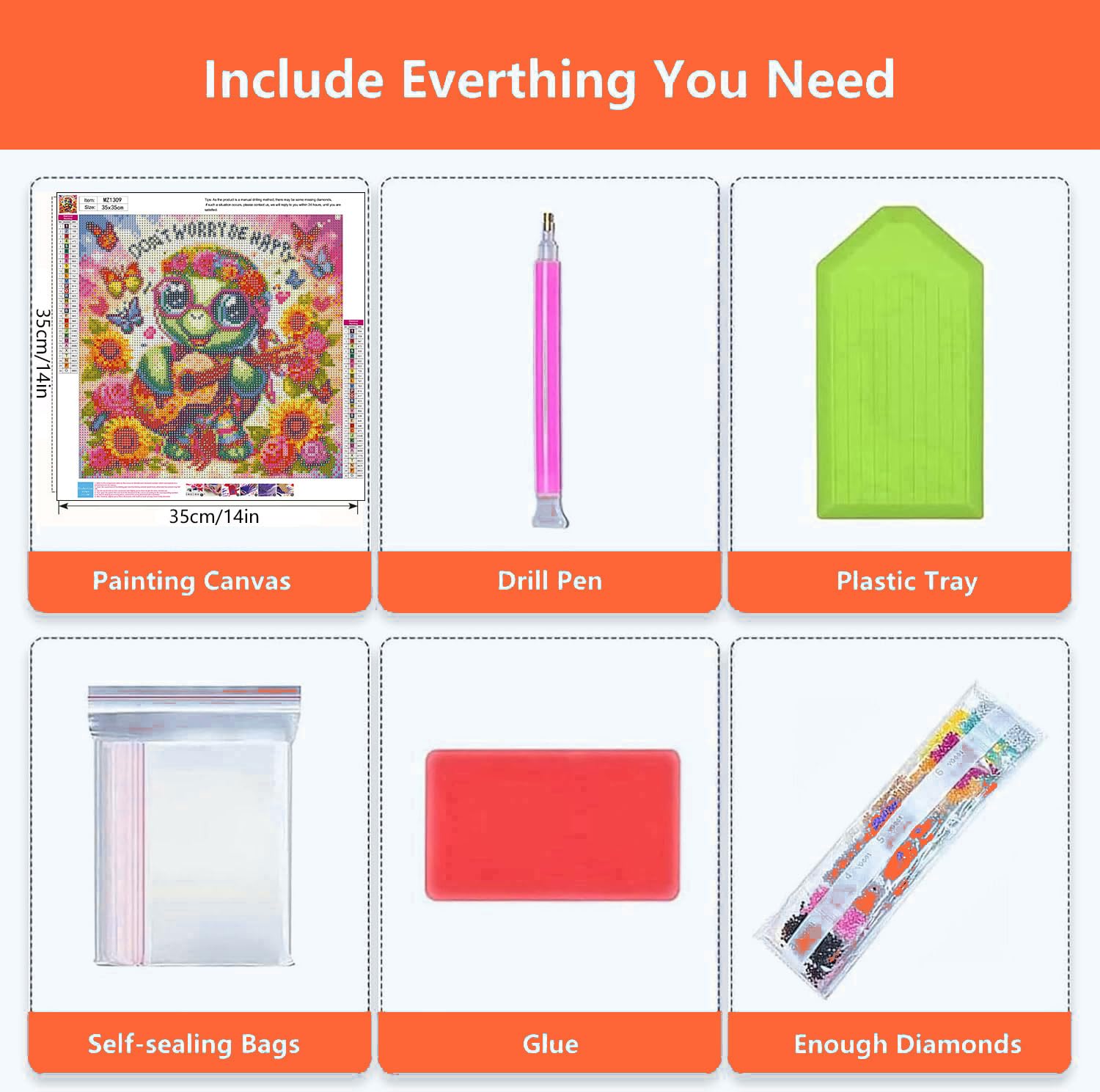 - 【5D Diamond Painting Kits for Adults】14x14in turtlediamond painting, 1*point diamond pen, 1* diamond tray, 1*red glue clay, several plastic bags to store the diamonds, enough colorful round diamonds, we'll provide 30% diamond more than need.