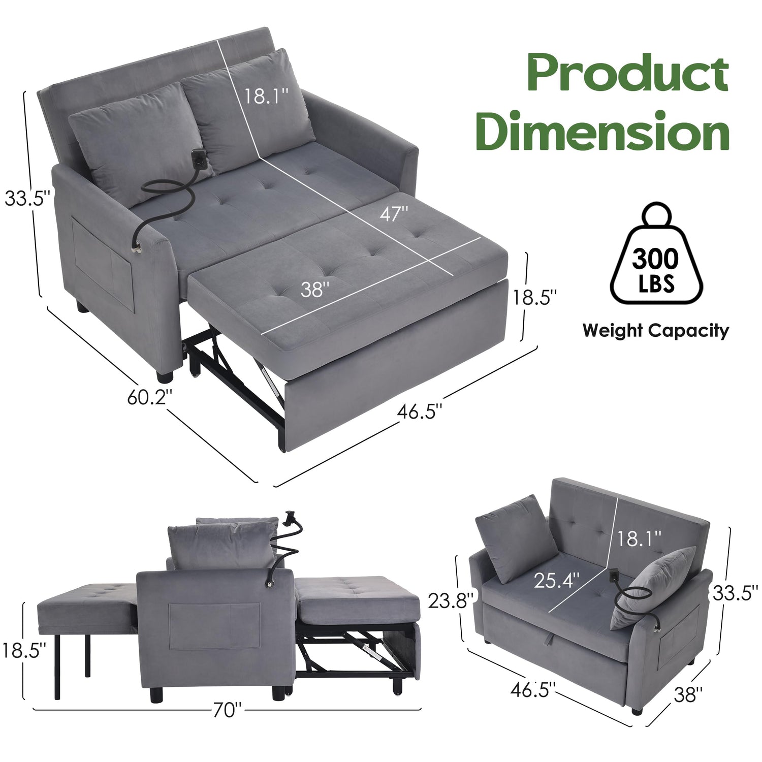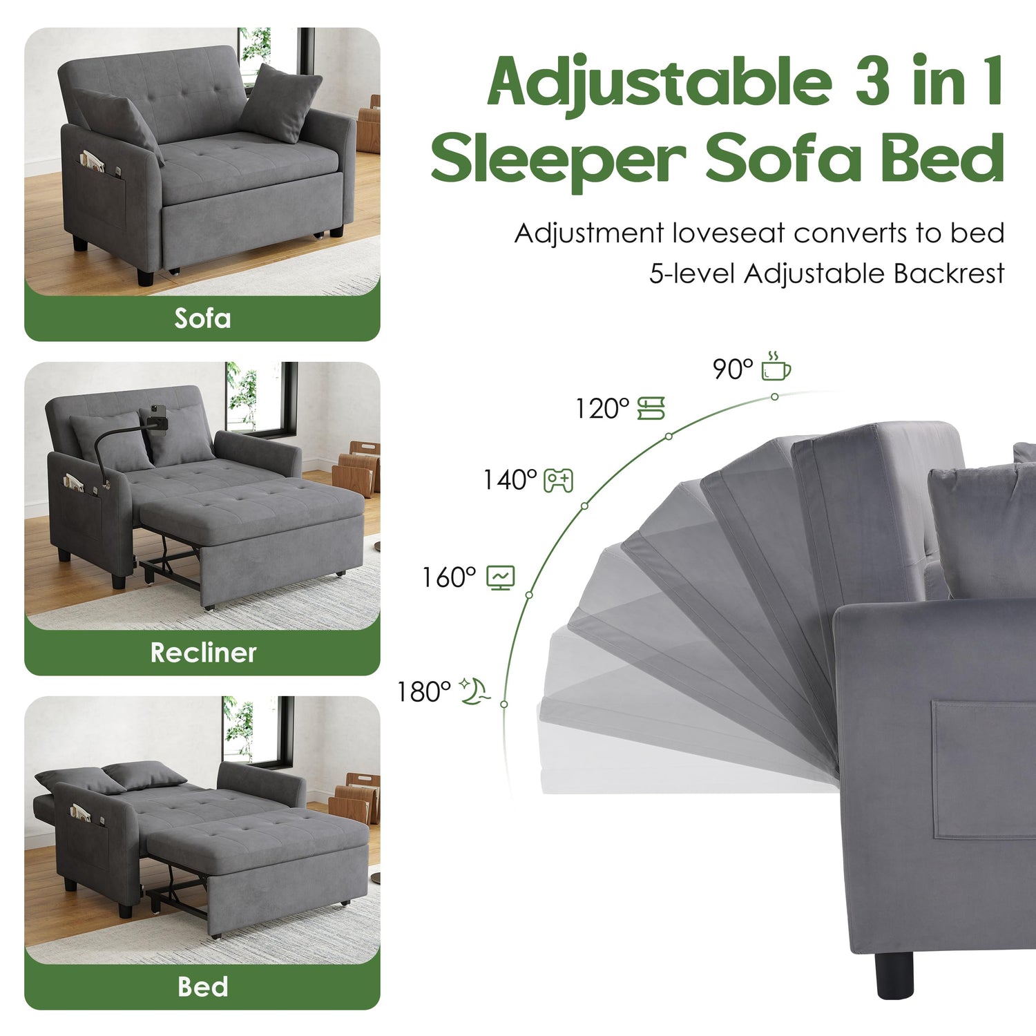 AYEASY Sleeper Sofa Bed, 3 in 1 Convertible Sleeper Couch Bed Pull Out, Small Loveseat Sofa, Futon Sofa Bed Full Size, 46" Velvet Love Seat with Pillow and Phone Holder for Living Room, Grey