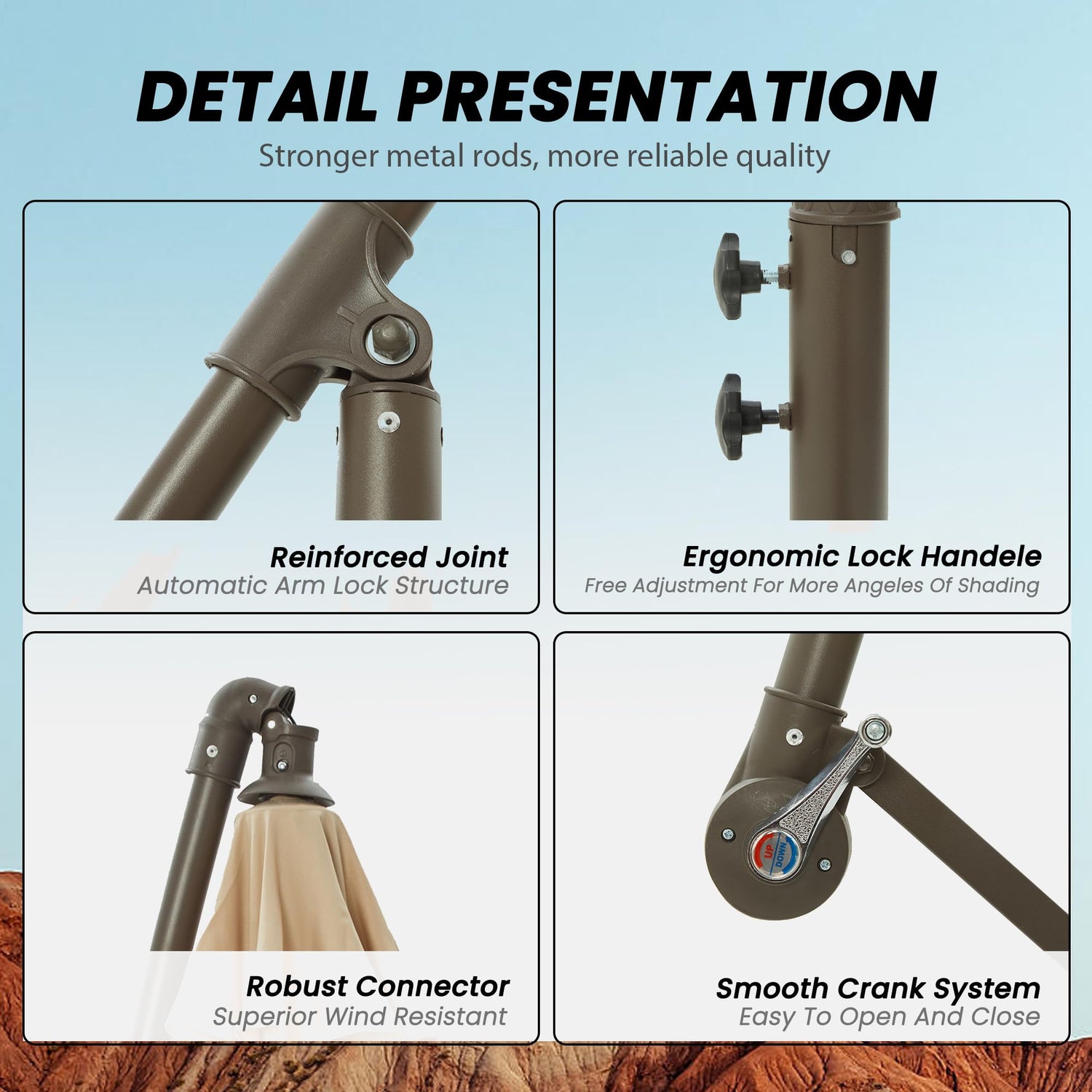 - Enhanced durability: The umbrella features a strengthened construction with four key upgrades: a stable double top lock, a secure unlimited tilt lock, reinforced pipe fittings, and a sturdy wrap triangle design. These improvements make it more reliable and durable.