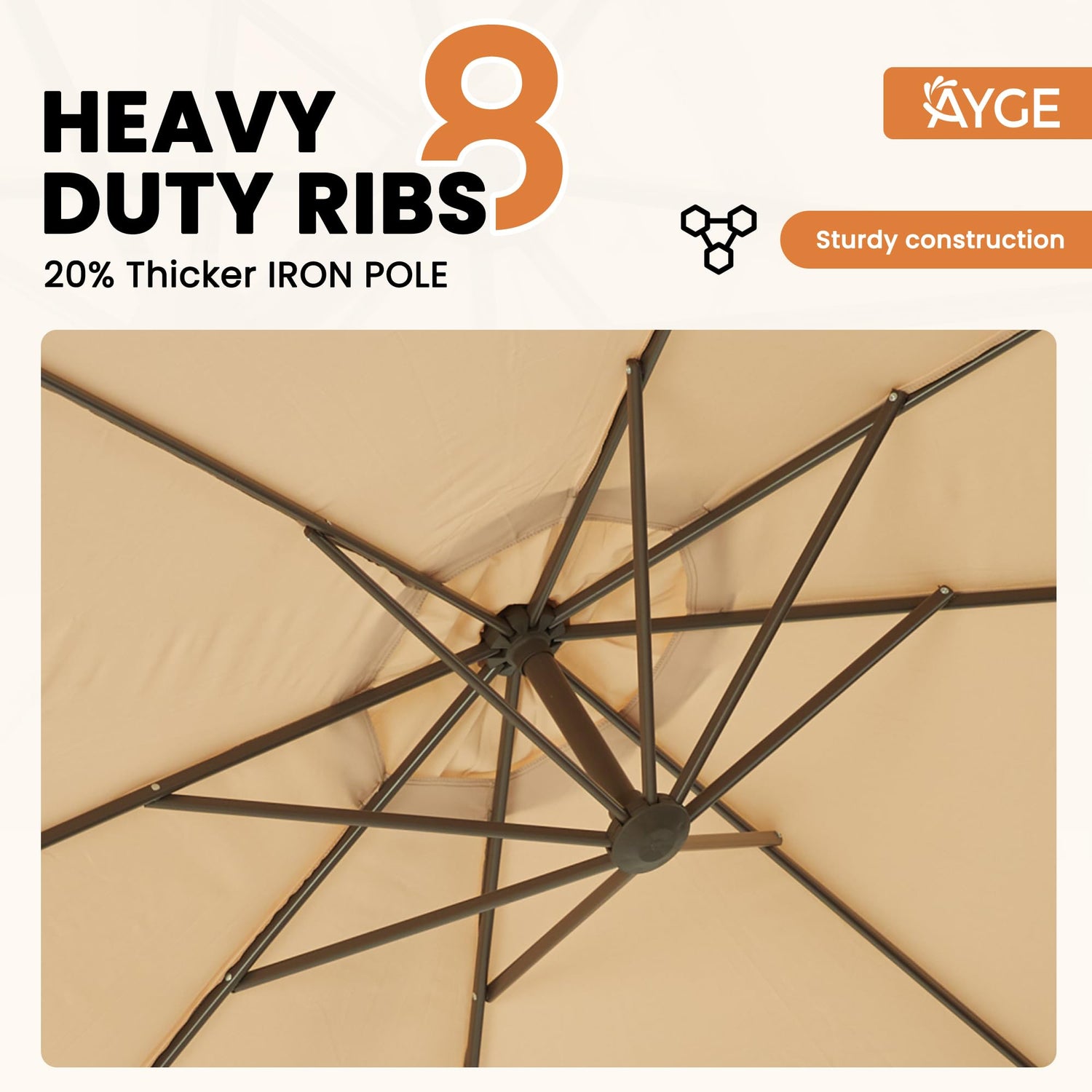 - Robust frame construction: With a durable 8-ribbed steel alloy frame and 1.9-inch umbrella rod, this structure is designed for stability. 20% thick rib (18x12mm) enhances surface support and balance, minimizing shaking. It can withstand winds of up to 30 MPH, and the dual powder-coated surface ensures excellent rust protection.