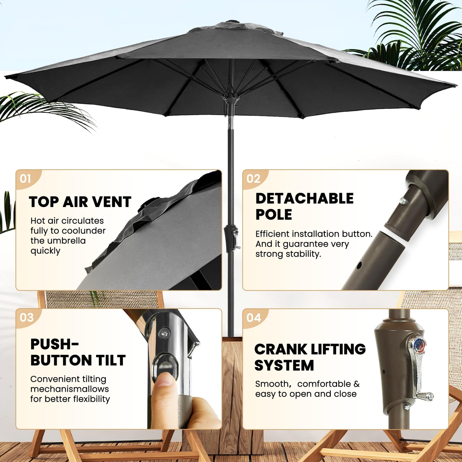 - VERSATILE PATIO UMBRELLA: 9FT Patio Umbrella is ideal for diverse settings such as markets, gardens, decks, backyards, pools, and patio tables. Provides shade for 3 to 4 seat rectangular tables. Essential during sunny seasons, providing respite from harsh sunlight.