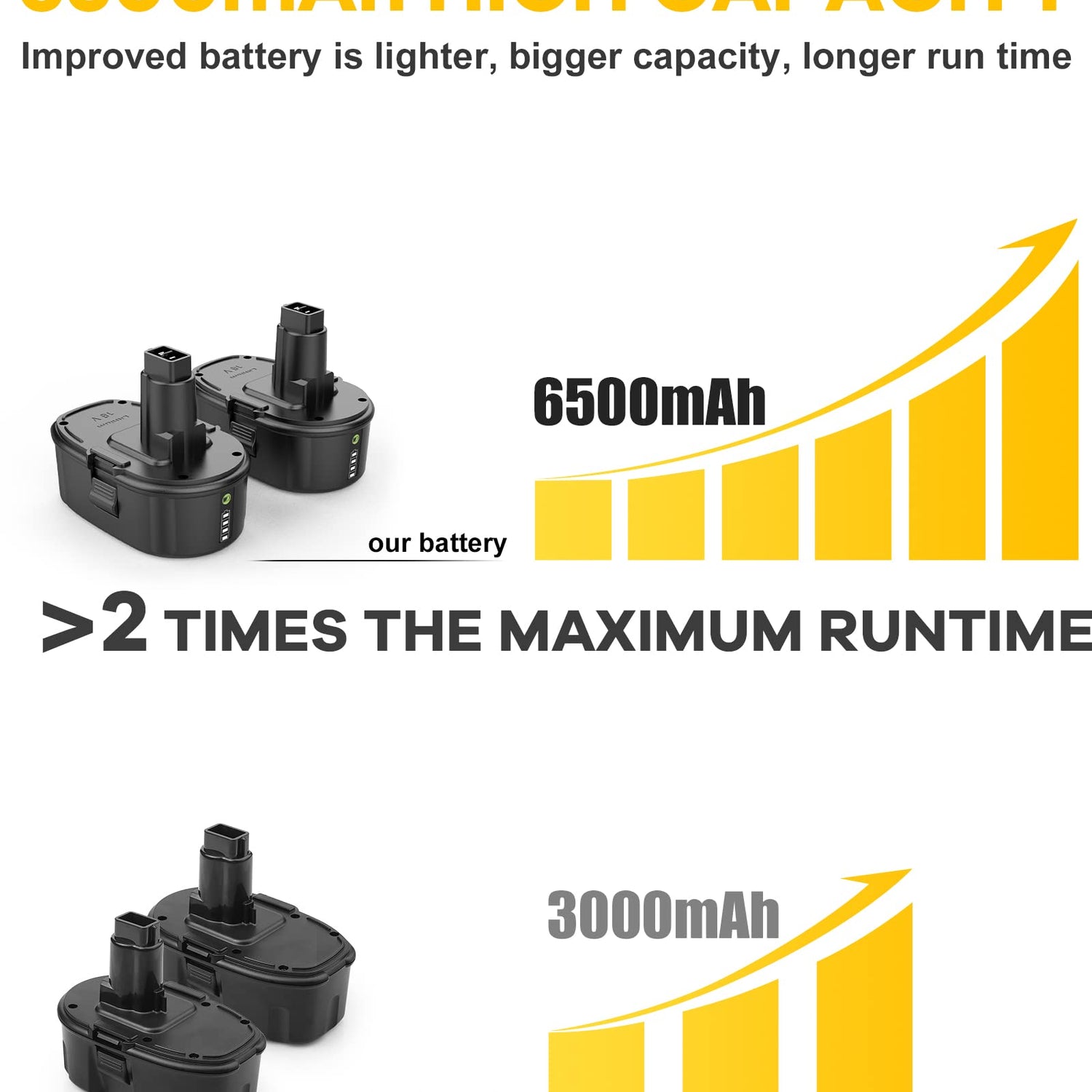 AYTXTG 2Pack 6.5Ah Lithium Battery Replace for Dewalt 18V XRP Ni-Cad Battery DC9096 DC9098 DC9099 DE9039 DE9095 + 2 Port DC9320 Fast Dual Charger for Dewalt 7.2V-18V XRP NI-CD NI-MH Battery