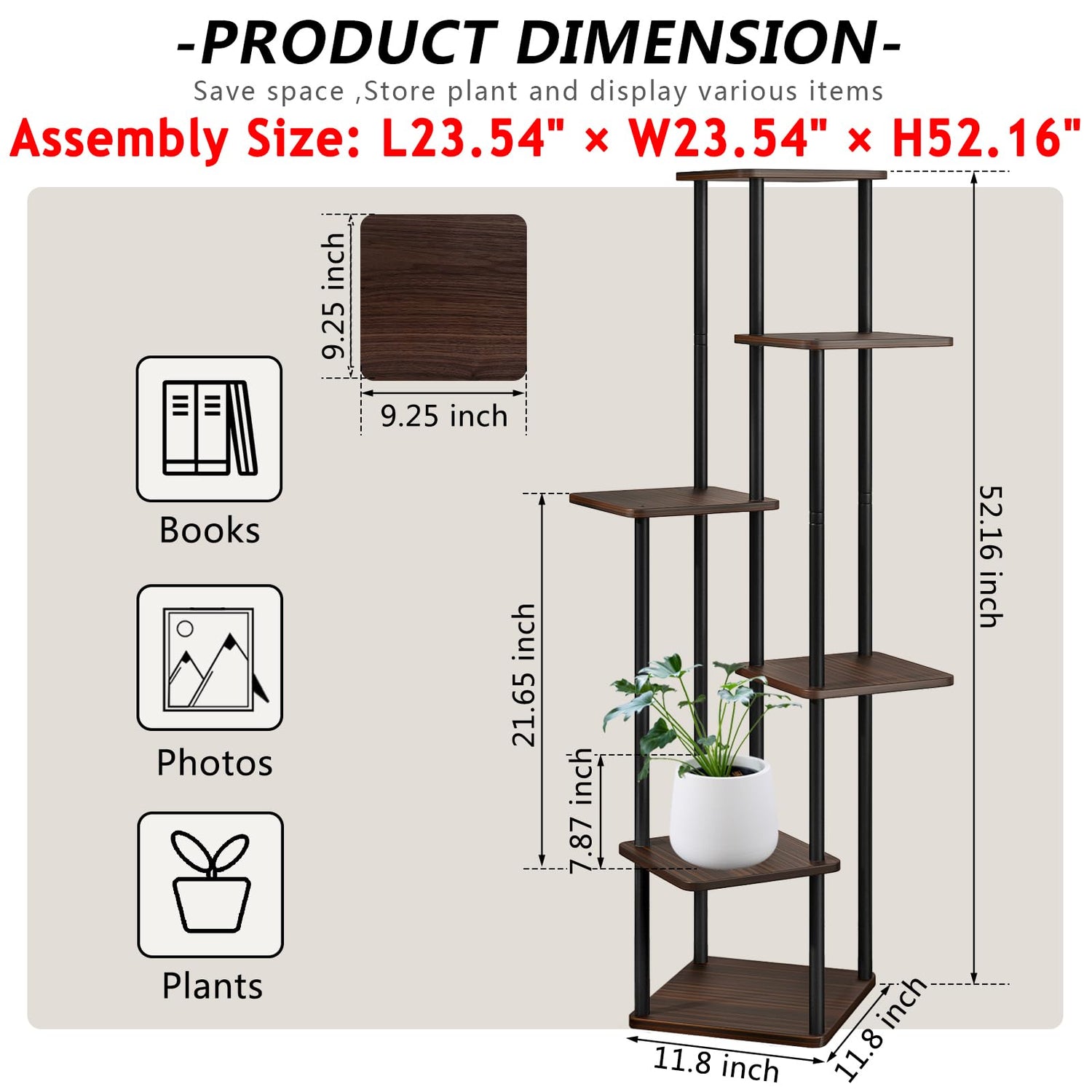 - 【6 Tier Tall Plant Shelf】The Indoor Plant Stand includes 6 shelves, 22.79(L) x 22.79(W) x 52.16(H) inches,perfect for flower pots of various sizes and shapes, each plant can soak up sufficient sunlight to thrive. In addition to showcasing your lovely plant, you can also use it for your pictures or memorable knickknacks.