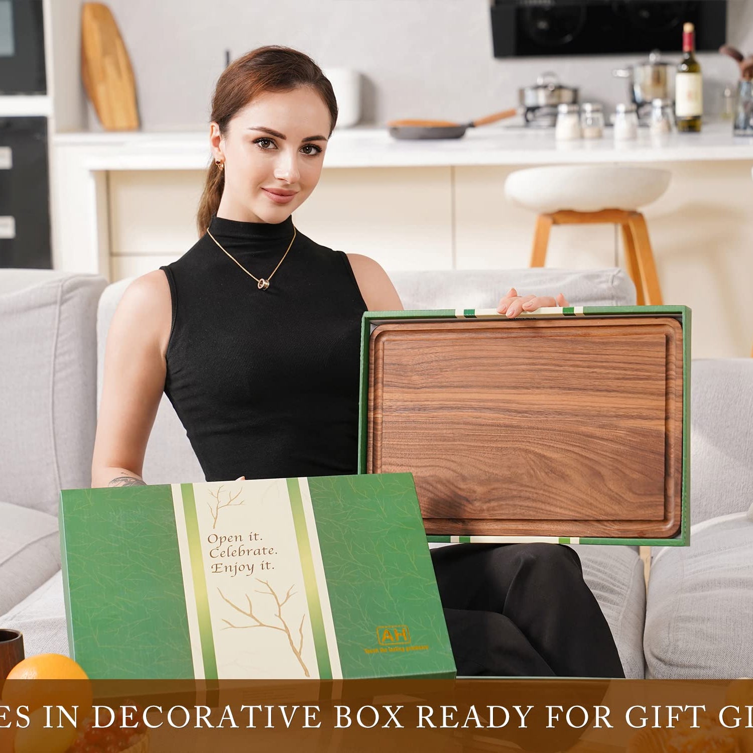 AZRHOM Large Walnut Wood Cutting Board for Kitchen 17x11 (Gift Box) with Juice Groove Handles Non-slip Mats Thick Reversible Butcher Block Chopping