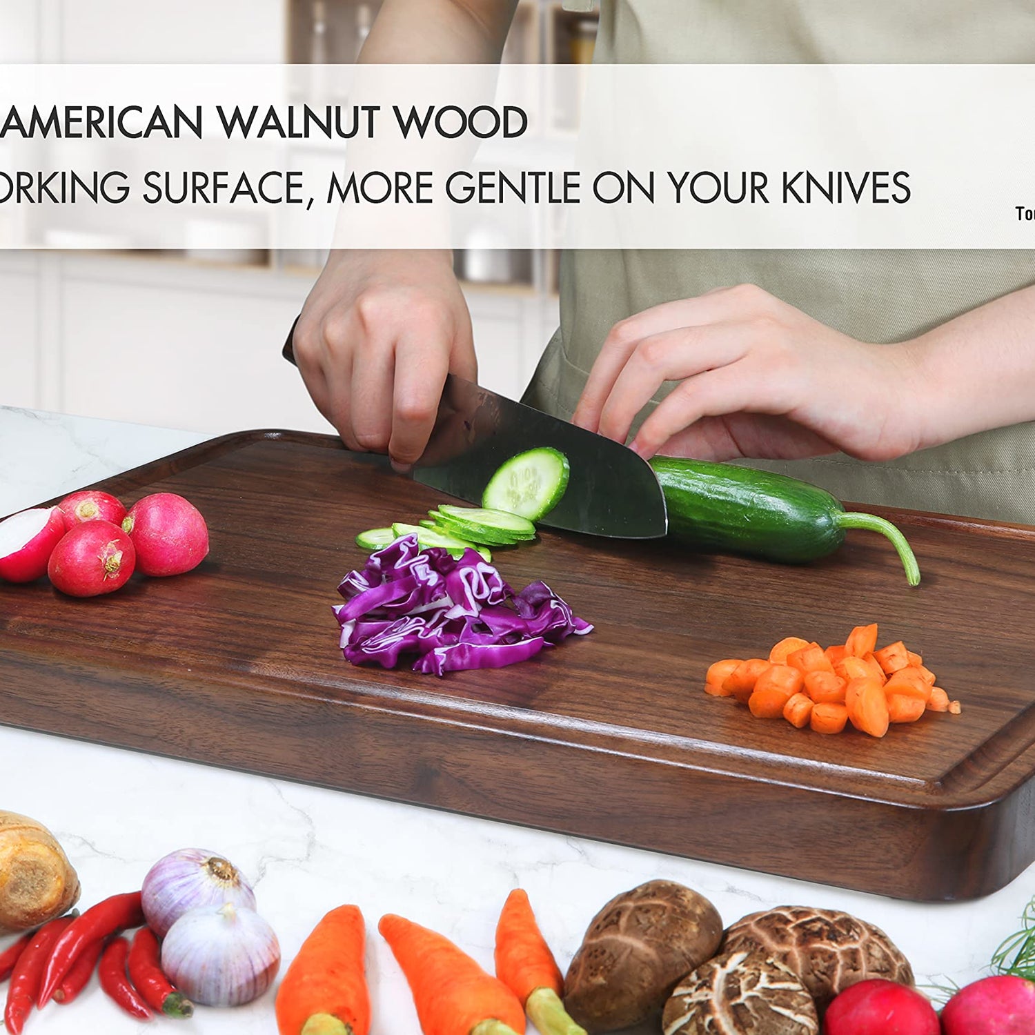 - Beautiful High-End Walnut Wood – American walnut wood with unique colors and textures, can add extra elengence and beauty to your kitchen and life. It has always been the first choice for making high-end cutting boards. Very durable and sturdy, do not smell and very easy to use and clean.( Please do not wash with a dish-washer to have a longer life) Pre-oiled, you can use directly out of box