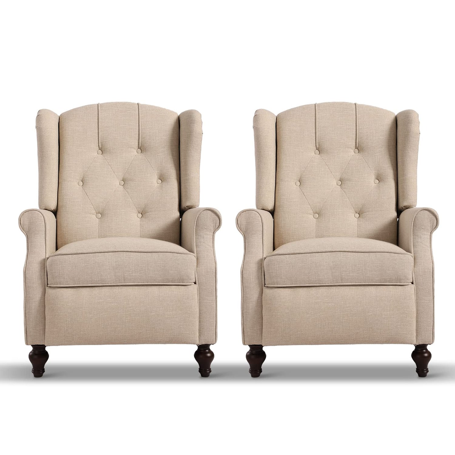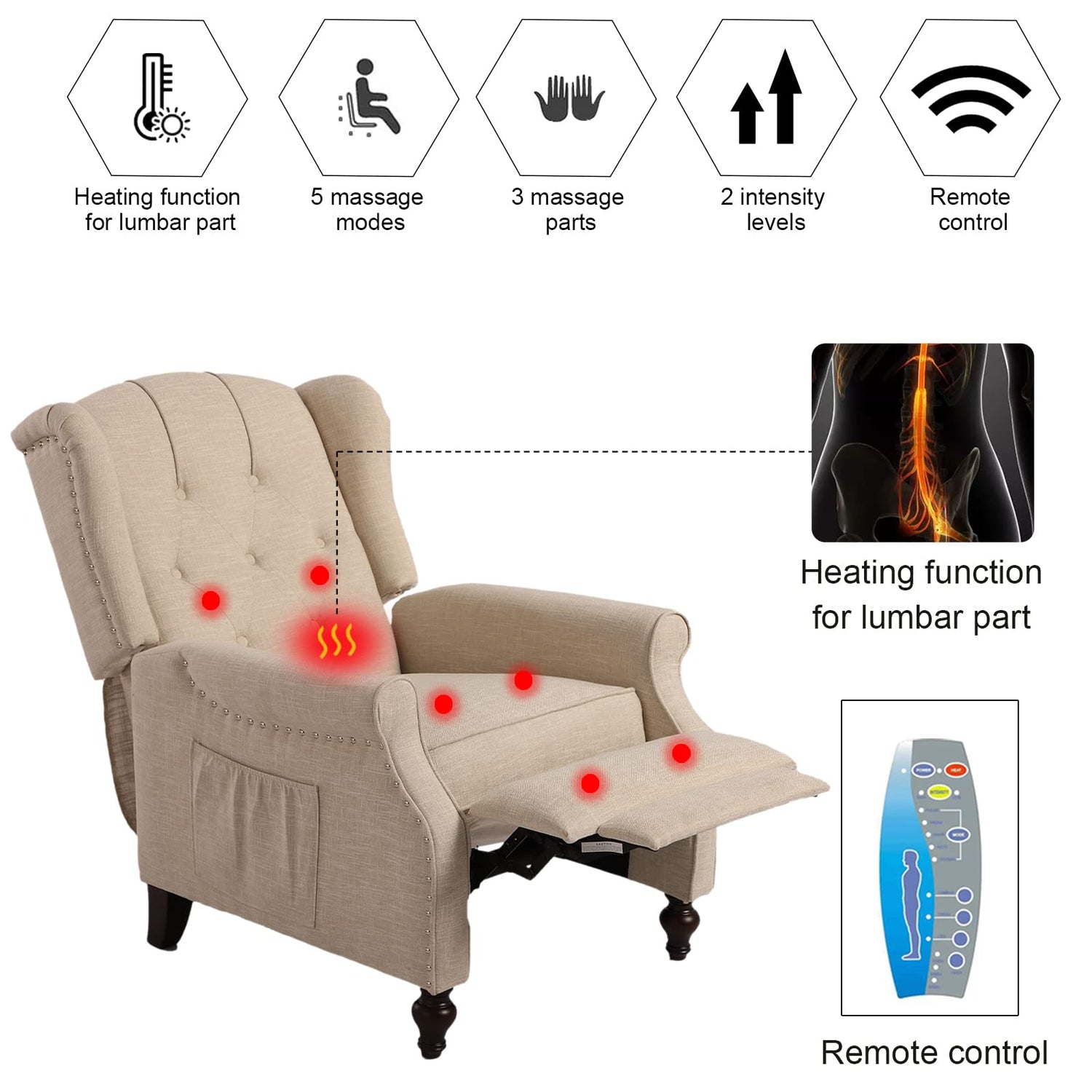 B BAIJIAWEI Set of 2 Recliner Wingback Chairs - Tufted Arm Chairs with Massage, Heat & Remote Control - Fabric Push Back Recliner with Heating Function, Adjustable Backrest (Beige)