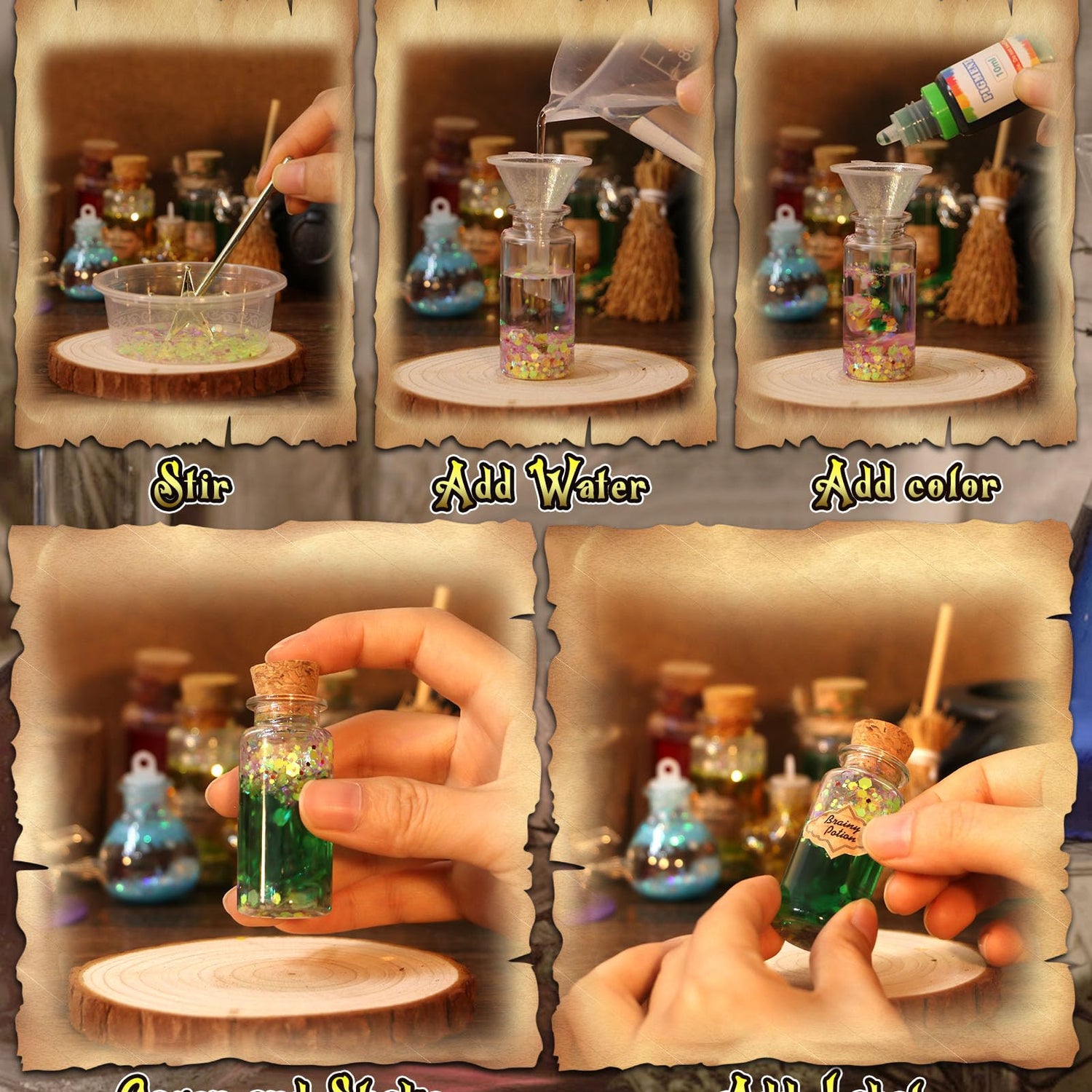 - DIY 20 POTIONS: Here are 10 regular shaped medicine bottles and 10 irregular shaped bottles (5 different shapes). Kids can pick anyone as they like. There are many methods for making potions here in the guidebook that kids can easily and happily make. They are interesting and charming enough to give children a fun time. And little wizard can also use their creativity to create new magic. There are no limit on the creative. Great for sharing with friends, and make potion together