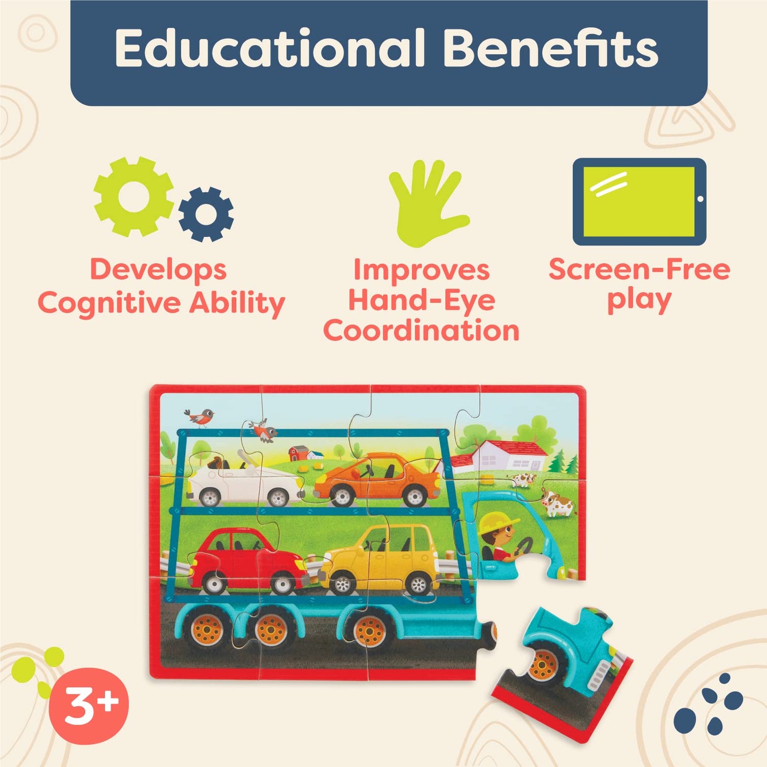 B. toys- Pack o' Puzzles - Trucks- Wooden Puzzle Set – 4 Truck Puzzles – Car Carrier, Loader, Excavator, Dump Truck – 12-Piece Jigsaw Puzzles for Kids – 3 Years +