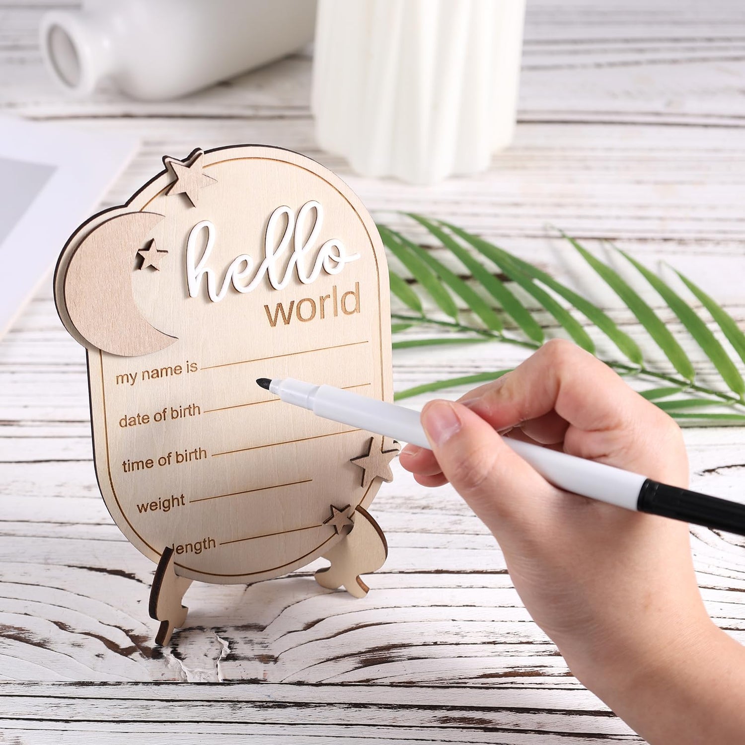 Baby Announcement Sign, 5.91x4.33 Inch Wooden Newborn Announcement Sign with Stand Wood Hello World Newborn Baby Name Sign Birth Announcement Sign for Home Hospital Nursery