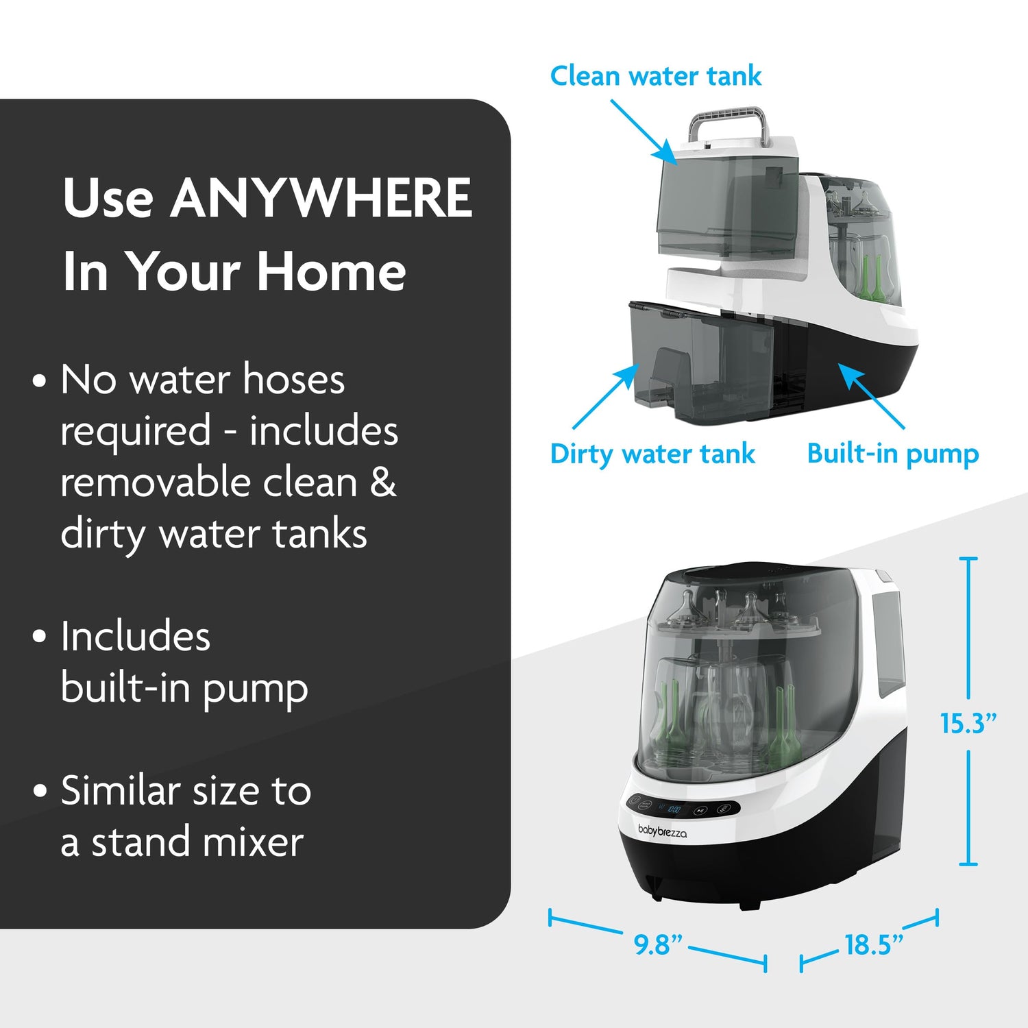 Details: Say goodbye to your bottle brush and drying rack and say hello to the first appliance that automatically washes, sterilizes and dries bottles and accessories at the push of a button! The Bottle Washer Pro powerfully cleans off milk residue with 20 high pressure spray jets that thoroughly wash and rinse bottles, pump parts, sippy cups and accessories inside and out. The machine also uses natural steam to kill 99.9% of germs, then dries completely with germ-free, HEPA-filtered hot air. The Bottle Washer Pro holds 4 bottles, pump parts, sippy cups and accessories from virtually all brands, offers 6 functions, and is clinically proven to clean significantly more effectively than bottle brushes. It has removable clean and dirty water tanks instead of a messy drain hose, so it doesn’t require a sink hook up, and can be used anywhere in your kitchen or around the house - even in the nursery or bedroom! This all-in-one cleaning machine uses 85% less water than handwashing. 1 year limited warranty (not valid if shipped outside the US or if another brand of detergent tablet or replacement part not made by Baby Brezza is used).