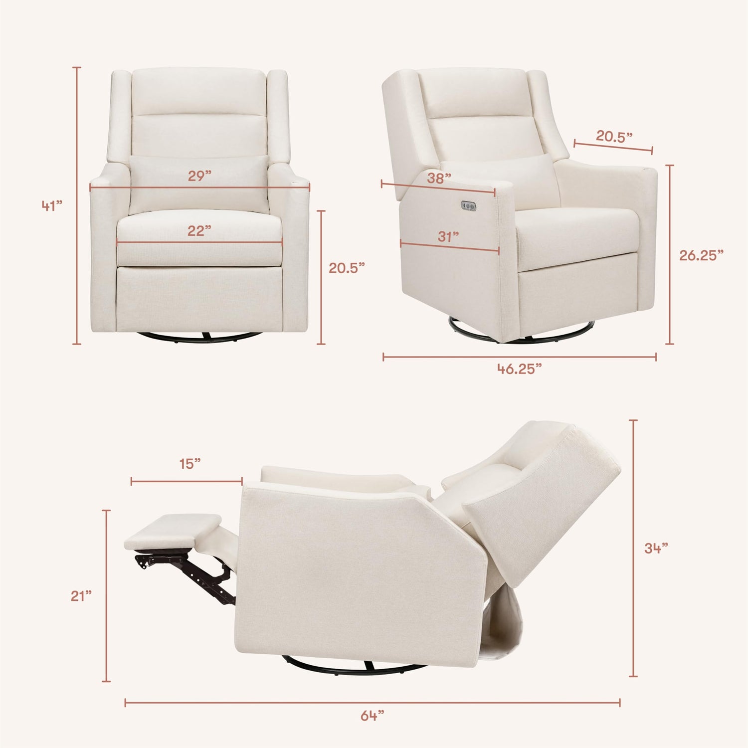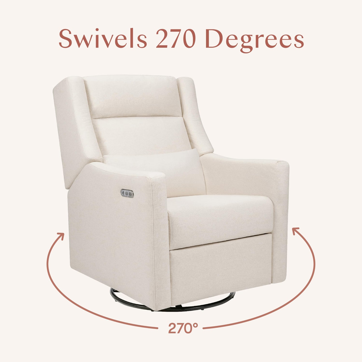 - Power Glider Recliner Nursery Chair: Enjoy a 270° swivel, smooth gliding motion, and effortless reclining at the push of a button. Equipped with a built-in USB charging port, our swivel rocking chair for nursery arrives fully assembled and ready for use.