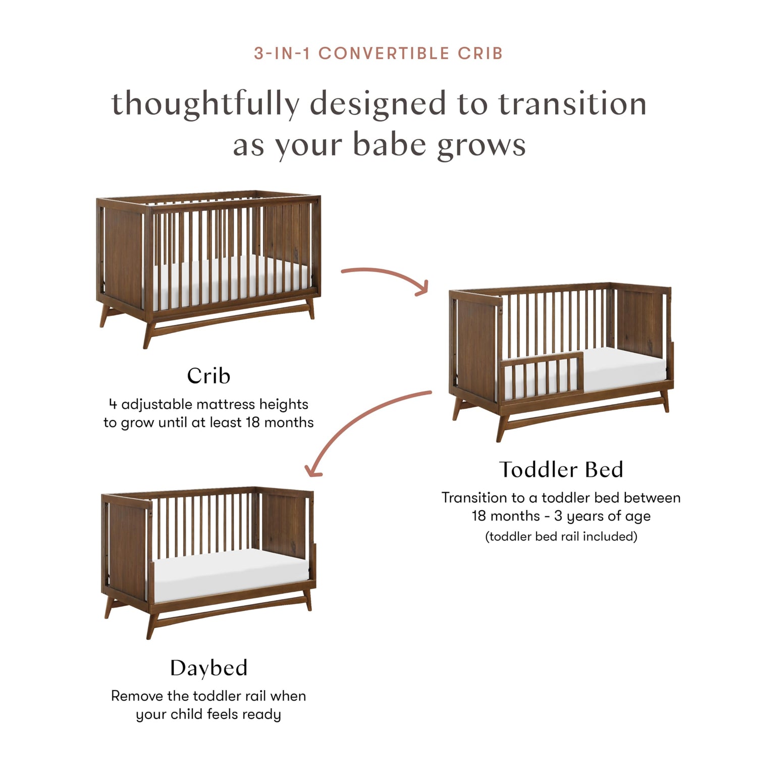 Details: The Peggy 3-in-1 Convertible Crib encapsulates timeless mid-century modern design. With an included conversion kit to transition from crib to toddler bed to daybed and GREENGUARD GOLD Certified for indoor air quality.