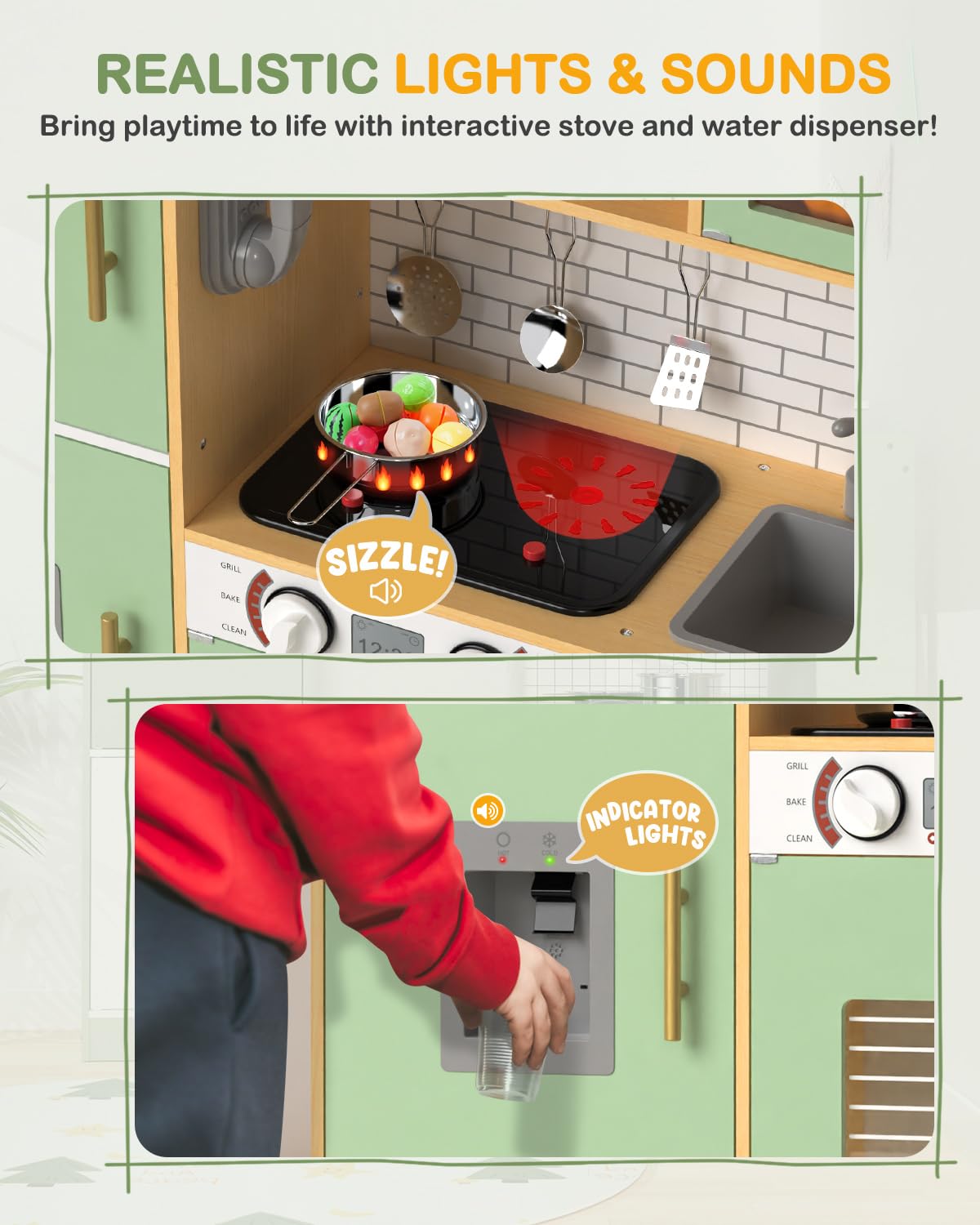 - High-Quality Materials: This wooden kitchen playset is made from durable wood, ensuring a safe and smooth play surface for children, meeting the ASTM and CPSIA standards