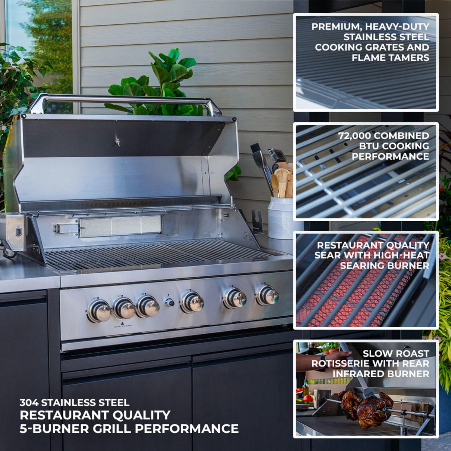 Backyard Discovery Fusion Flame Turn-Key Outdoor Kitchen with 38-inch Stainless Steel 5-burner Grill Island, Sear Zone, Infrared Burner, Outdoor-Rated Refrigerator, Storage, Steel Roof for Deck, Patio