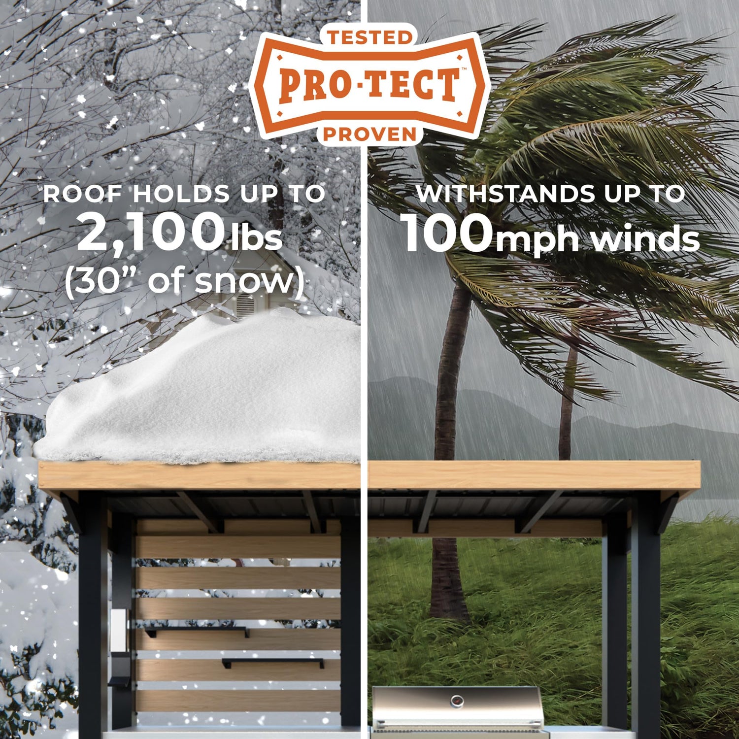- All-Weather Design: Pro-Tect Tested & Proven To Hold Snow Up To 50 Lbs. Per Sq. Ft. And Stand Up To Winds 100 Mph, With A Galvanized Steel Fully-Covered Roof You Can Enjoy Cooking Al Fresco Confidently In Any Weather.