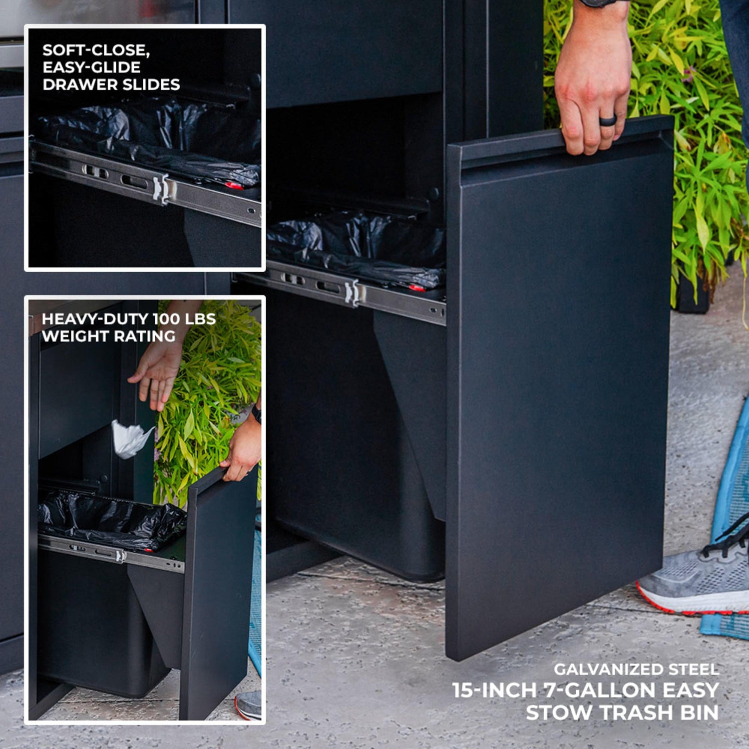 - Trash Stash: Our Easy Access 15-Inch Pull-Out Trash Bin Features Soft-Close Drawer Slides And Easy-Stow Technology. With 7-Gallon Capacity And 100 Lb. Waste Weight Rating At Your Fingertips And Hidden Out Of Sight.