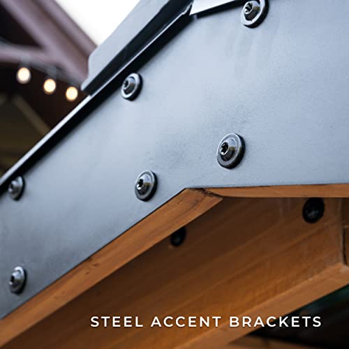 Invite your friends and family over because the captivating Granada Grill Gazebo with Outdoor Bar by Backyard Discovery creates the perfect entertaining space! Designed with a sleek low profile peak roof and made with attractive, naturally durable cedar wood; its light brown stain complements the trendy black steel roof and provides an ideal home for an outdoor bar and grilling space. You can be confident in the Granada Grill Gazebo with Outdoor Bar as it is a PRO-TECT Tested & Proven structure, able to withstand up to 4,780 pounds of weight (or up to 30 inches of snow) and up to 100 mph winds. The insulated steel roof reduces heat transfer by up to 20°, keeping you comfortable while grilling or entertaining in all regions. Customizable configurations allow you to build the Granada Grill Gazebo anywhere in your backyard to make sure it complements your personal outdoor space. Once constructed, customize your bars to be standard countertop height or standard bar height ensuring you a perfect al fresco experience. Plus, with the exclusive PowerPort, you have three USB ports and three electrical outlets to use for blenders, phones, speakers, lights, or anything else you might want to power up when cooking and eating outside. Schedule a wine tasting BBQ immediately under the Granada Grill Gazebo with Outdoor Bar! Your guests will thank you!